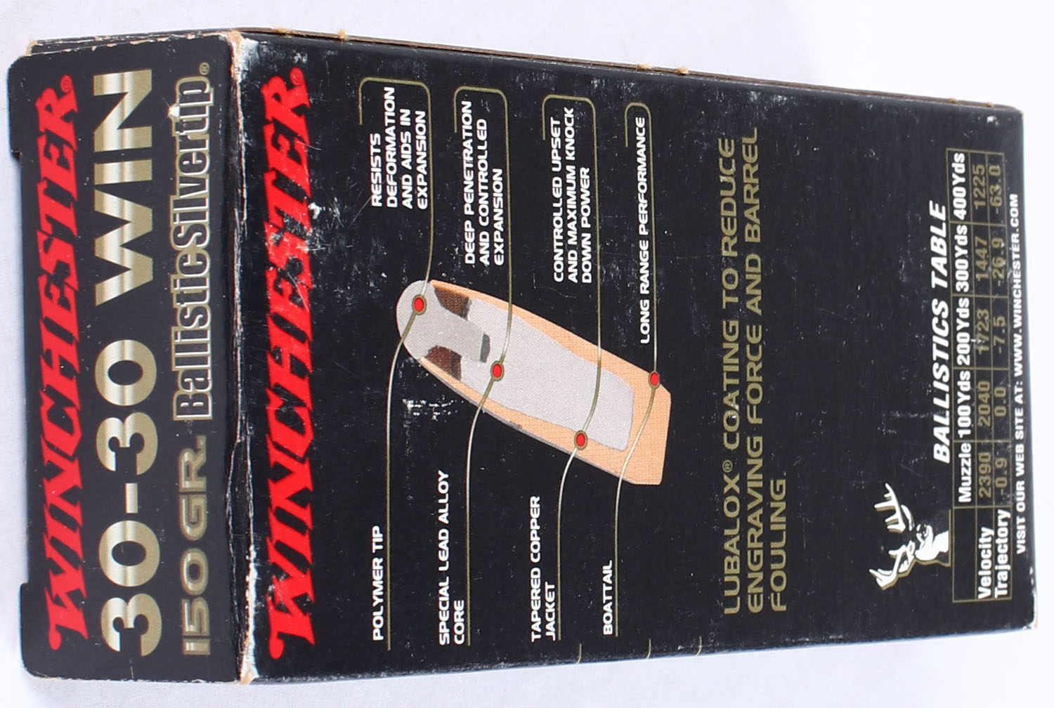 Winchester, Supreme, .30-30 WIN., 150 Grain Ballistic Silvertip, Full, 1pc., Black & red box, box is solid with scuffing, very minor corner wear, end flaps are solid, ammo is excellent. Grade: Very Good ++ - Value: 24 to 36