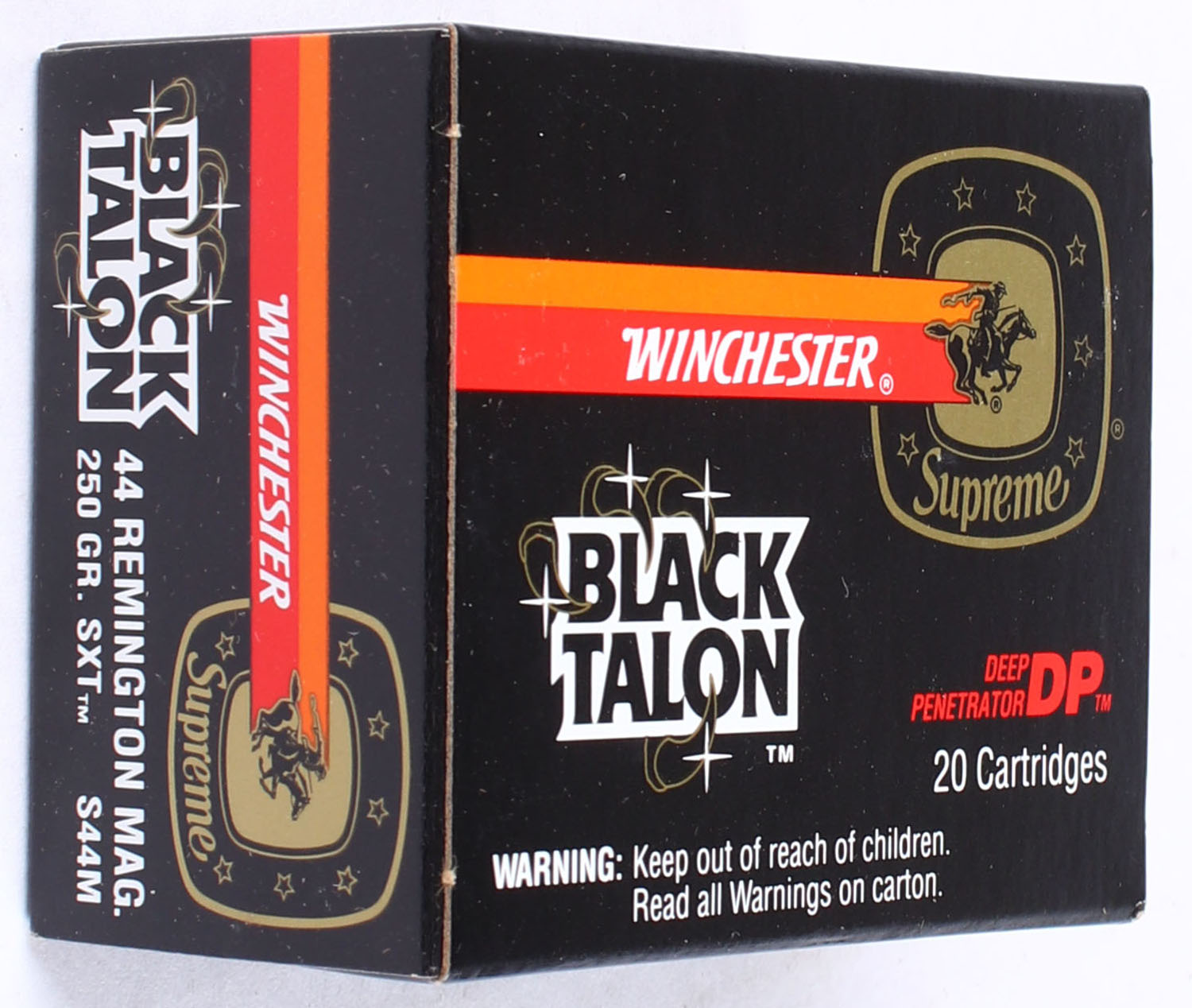 Winchester, Black Talon, .44 Remington Magnum, 250 Gr. SXT, Full, 1pc. Black red & orange box, box is MINT with minty color, corners are sharp, edges are crisp, end flaps are solid, ammo is minty. Grade: MINT - Value: 60 to 90