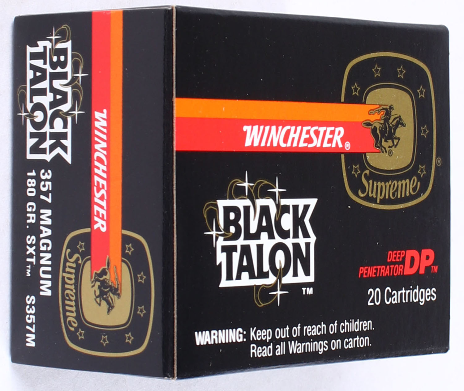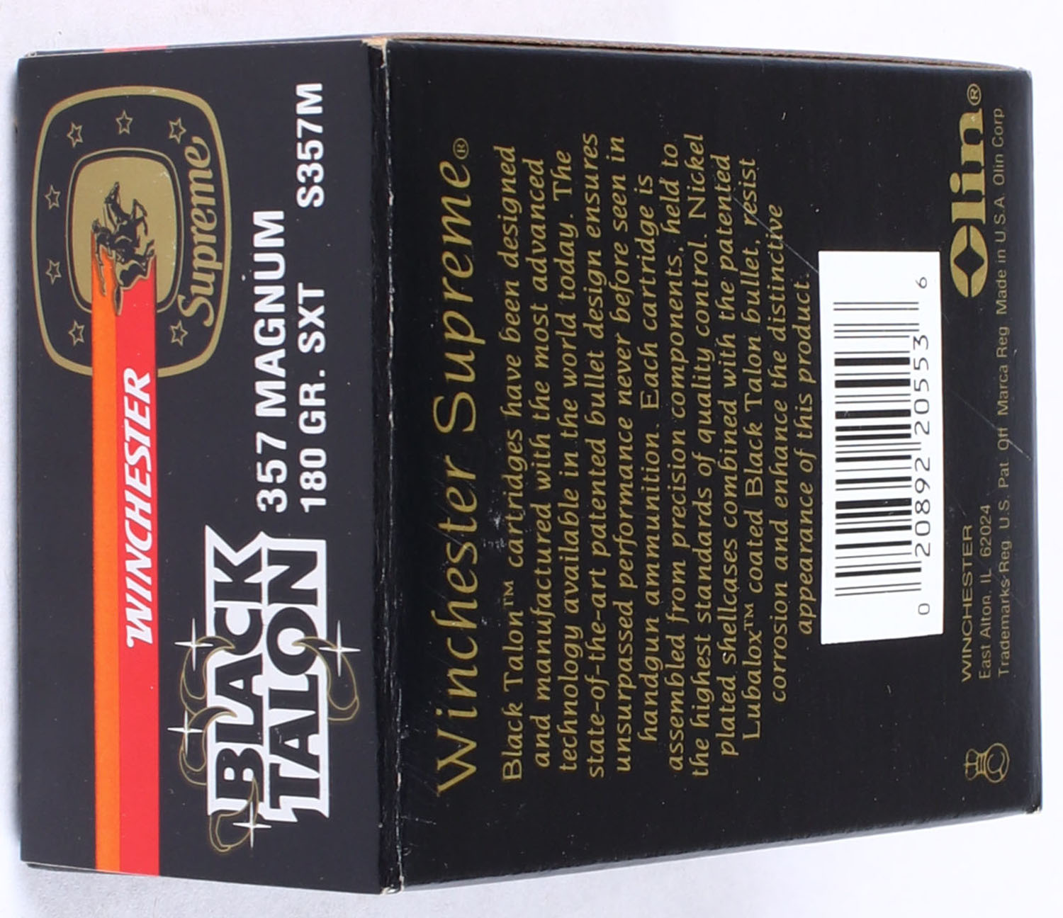 Winchester, Black Talon, .357 Magnum, 180 Gr. SXT, Full, 1pc. Black red & orange box, box is solid with excellent to minty color, minor shelf & corner wear, edges are crisp, end flaps are solid, ammo is minty. Grade: MINT - Value: 90 to 120