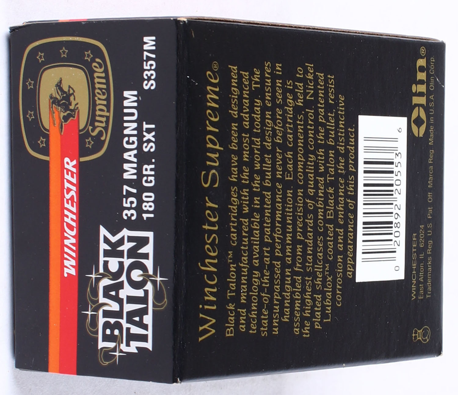 Winchester, Black Talon, .357 Magnum, 180 Gr. SXT, Full, 1pc. Black red & orange box, box is solid with excellent to minty color, minor shelf & corner wear, edges are crisp, end flaps are solid, ammo is minty. Grade: MINT - Value: 90 to 120