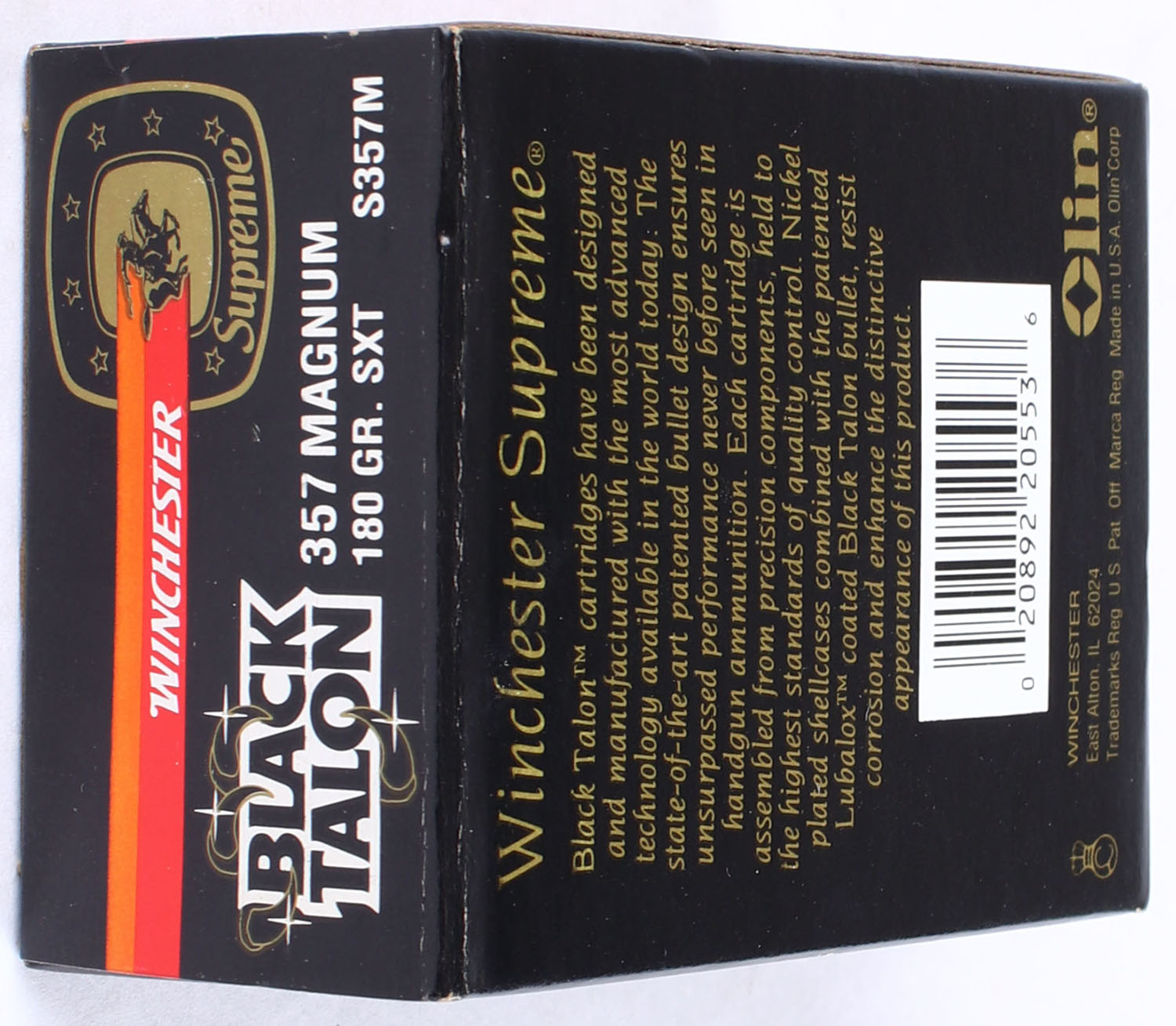 Winchester, Black Talon, .357 Magnum, 180 Gr. SXT, Full, 1pc. Black red & orange box, box is solid with excellent to minty color, minor shelf & corner wear, edges are crisp, end flaps are solid, ammo is minty. Grade: MINT - Value: 90 to 120