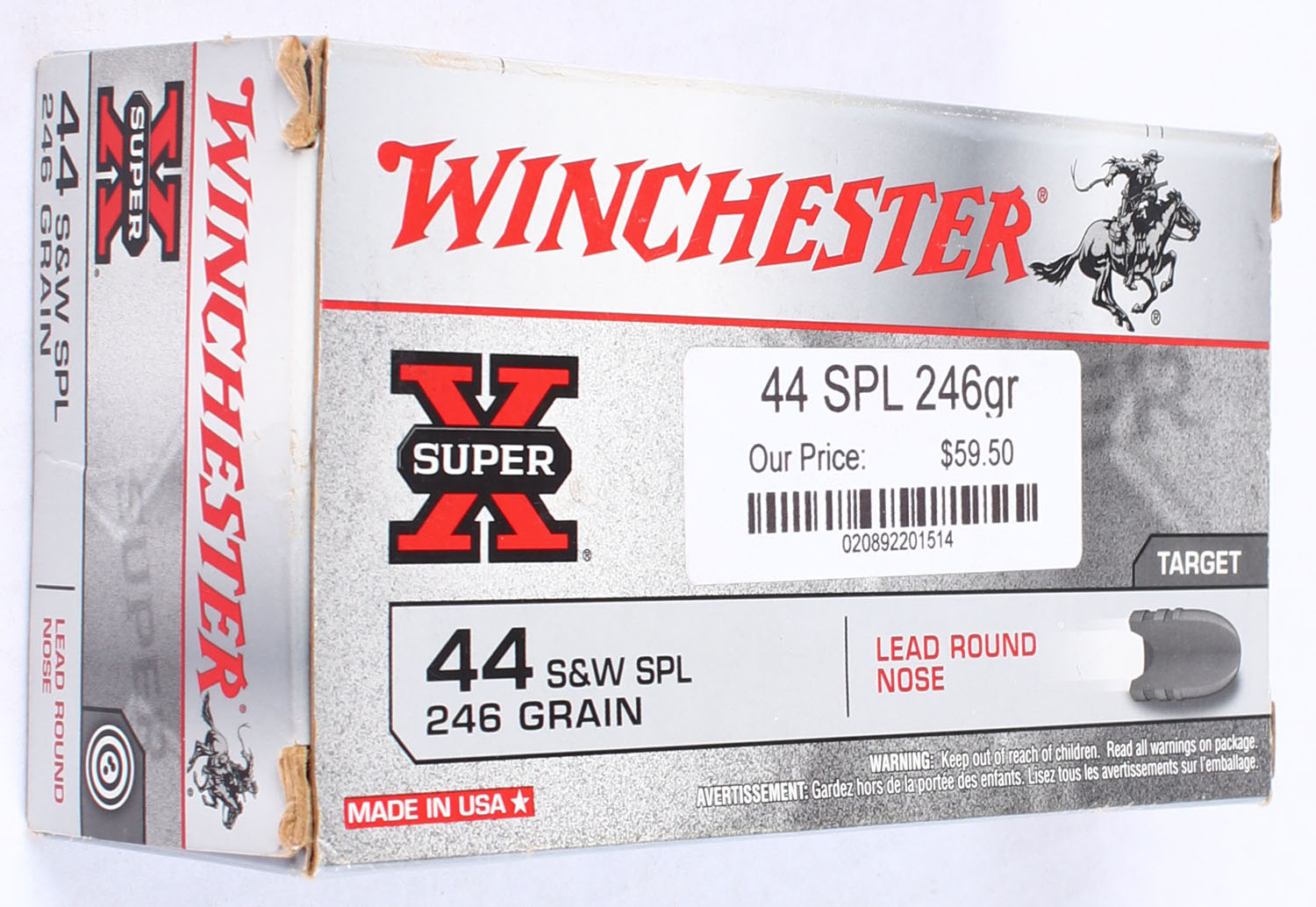 Winchester, Super X, .44 Smith & Wesson Special, 246 Grain Lead R.N., Full, 1pc. Gray & red box, box is solid with sticker to front, minor corner wear, and flaps are solid, ammo is minty. Grade: Excellent - Value: 40 to 60