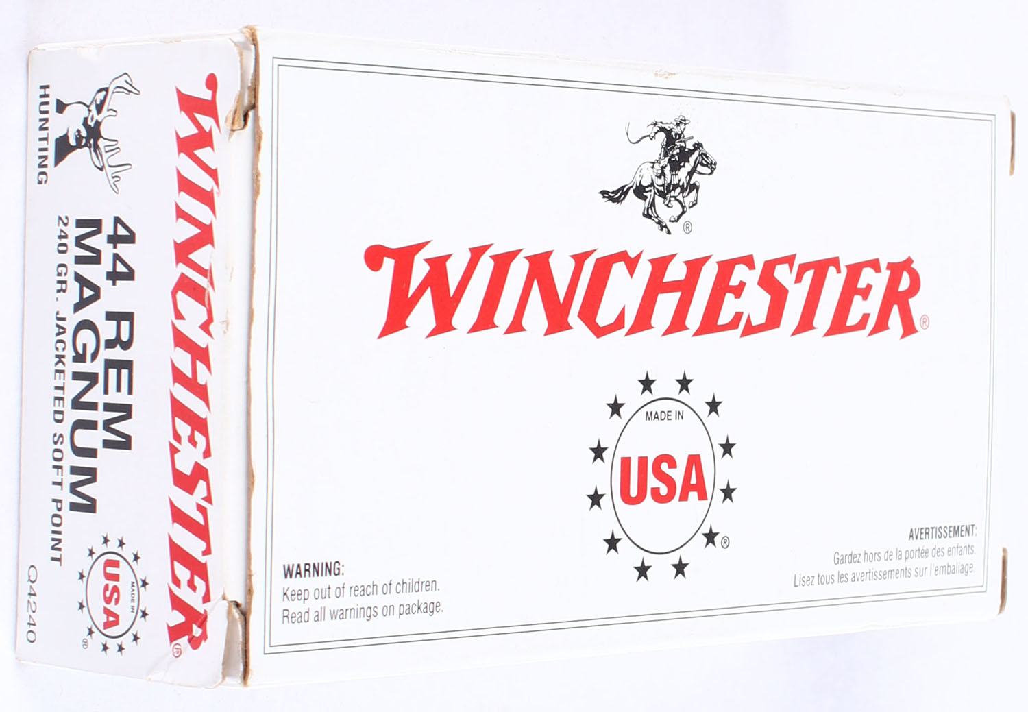 Winchester, USA, .44 Remington Magnum, 240 Grain Jacketed Soft Point, Full, 1pc. White & red box with black printing, box is solid with minty color, end flaps are solid, ammo is minty. Grade: Excellent + - Value: 40 to 60
