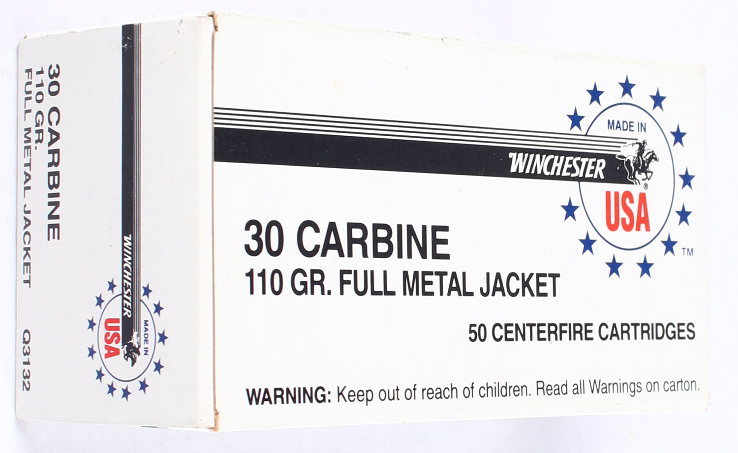 Winchester, USA, .30 Carbine, 110 Grain FMJ, Full, 1pc., multi-colored box, box is very sold, end flaps are solid, ammo is excellent. Grade: Excellent - Value: 40 to 60