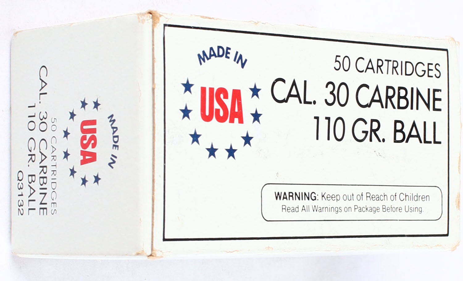 Winchester, USA, .30 Carbine, 110 Grain Ball, Full, 1pc., multi-colored box, box has light corner wear, end flaps are solid, ammo is excellent. Grade: Excellent - Value: 40 to 60