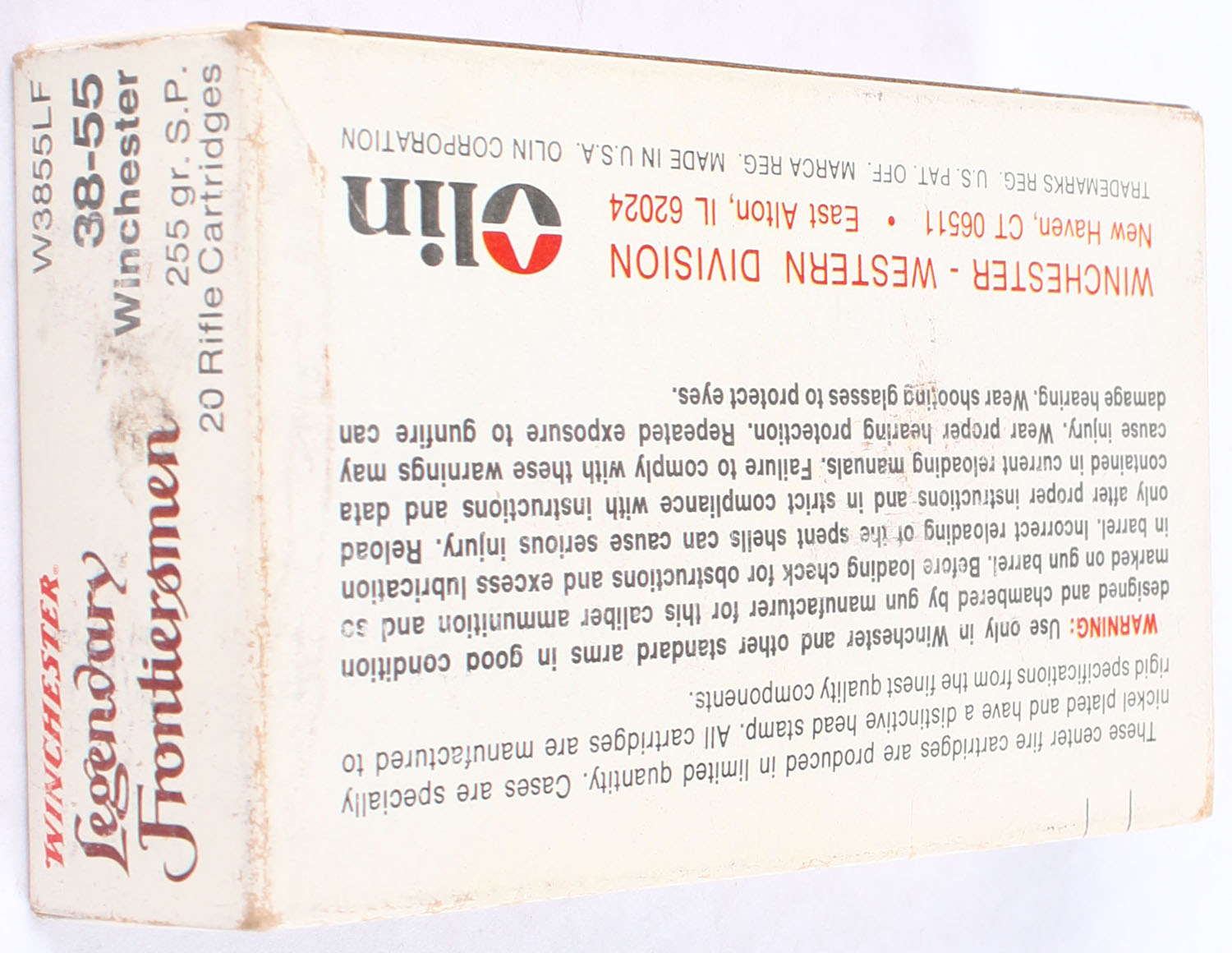 Winchester, Legendary Frontiersmen, .38-55 Winchester, 255 Grain Soft Point, Full, 1pc. Multi-colored box, box is solid with very good to excellent color, minor corner wear, edges are mostly crisp, end flaps are solid, ammo is minty. Grade: Excellent - Value: 80 to 120