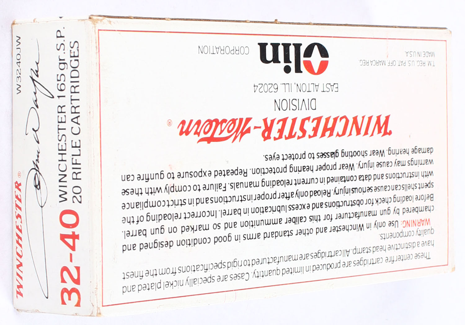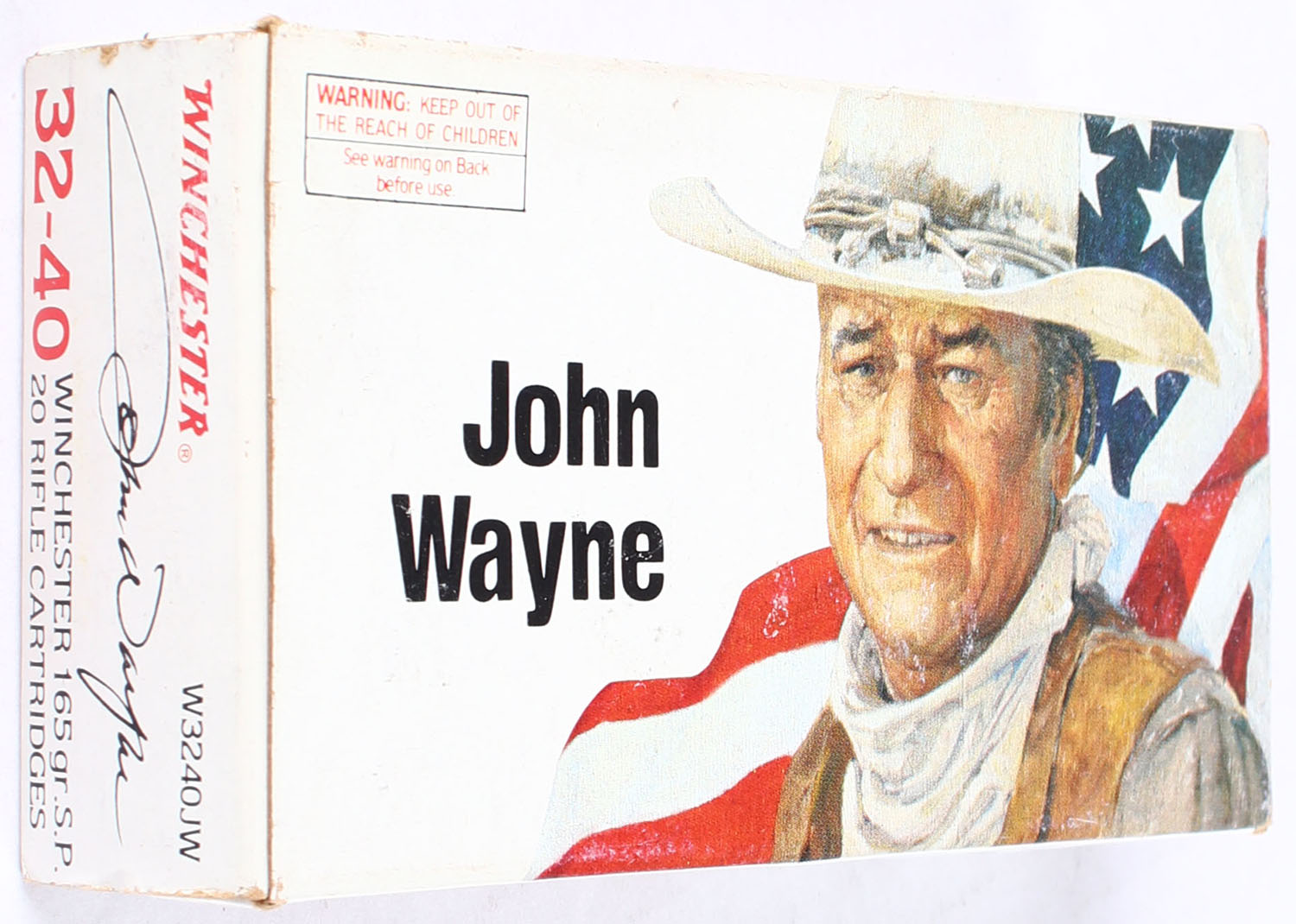 Winchester, John Wayne, .32-40 Winchester, 165 Grain Soft Point, Full, 1pc. White box featuring John Wayne, box is solid with excellent color, very minor age soiling, end flaps are solid, ammo is minty. Grade: Excellent + - Value: 80 to 120
