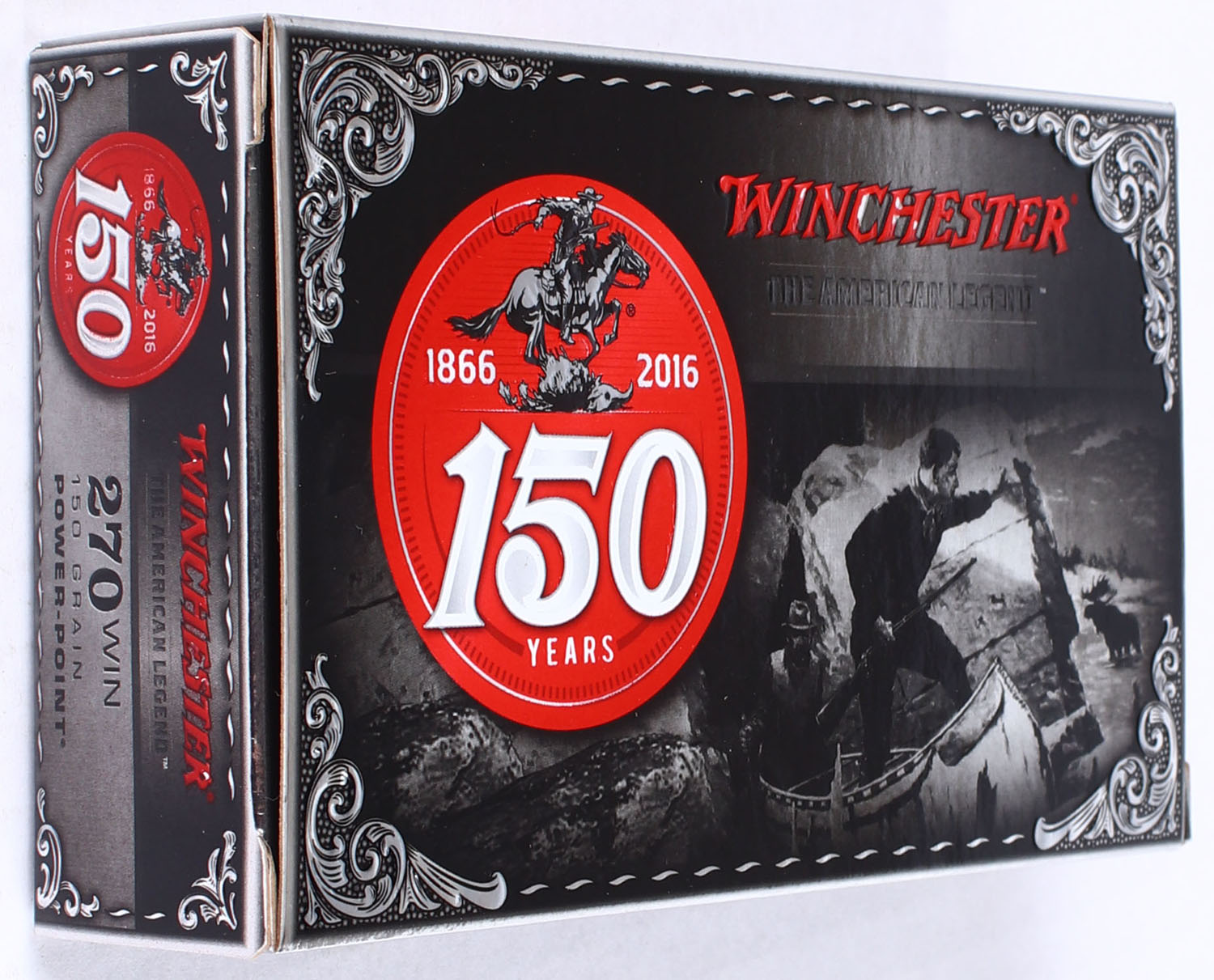 Winchester, The American Legend, 150 Year Commemorative box, .270 Winchester, 150 Grain Power-Point, Full, 1pc. Silver & red box, box is MINT with minty color, corners are sharp, edges are crisp, end flaps are solid, ammo is minty. Grade: MINT - Value: 100 to 150