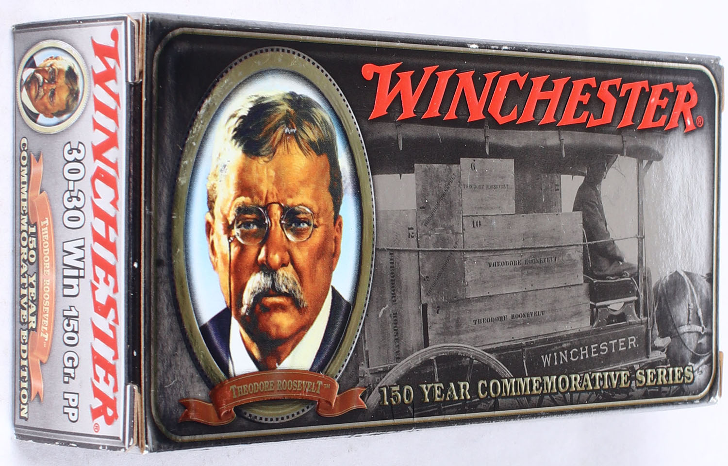 Winchester, Theodore Roosevelt 150 Year Commemorative Series, 30-30 Win, 150 Grain Power-Point, Full, 1pc. Silver box featuring the 26th president, box is very solid with excellent color, minor rub marks to top, corners are mostly sharp, edges are crisp, end flaps are solid, ammo is minty. Grade: Excellent ++ - Value: 100 to 150