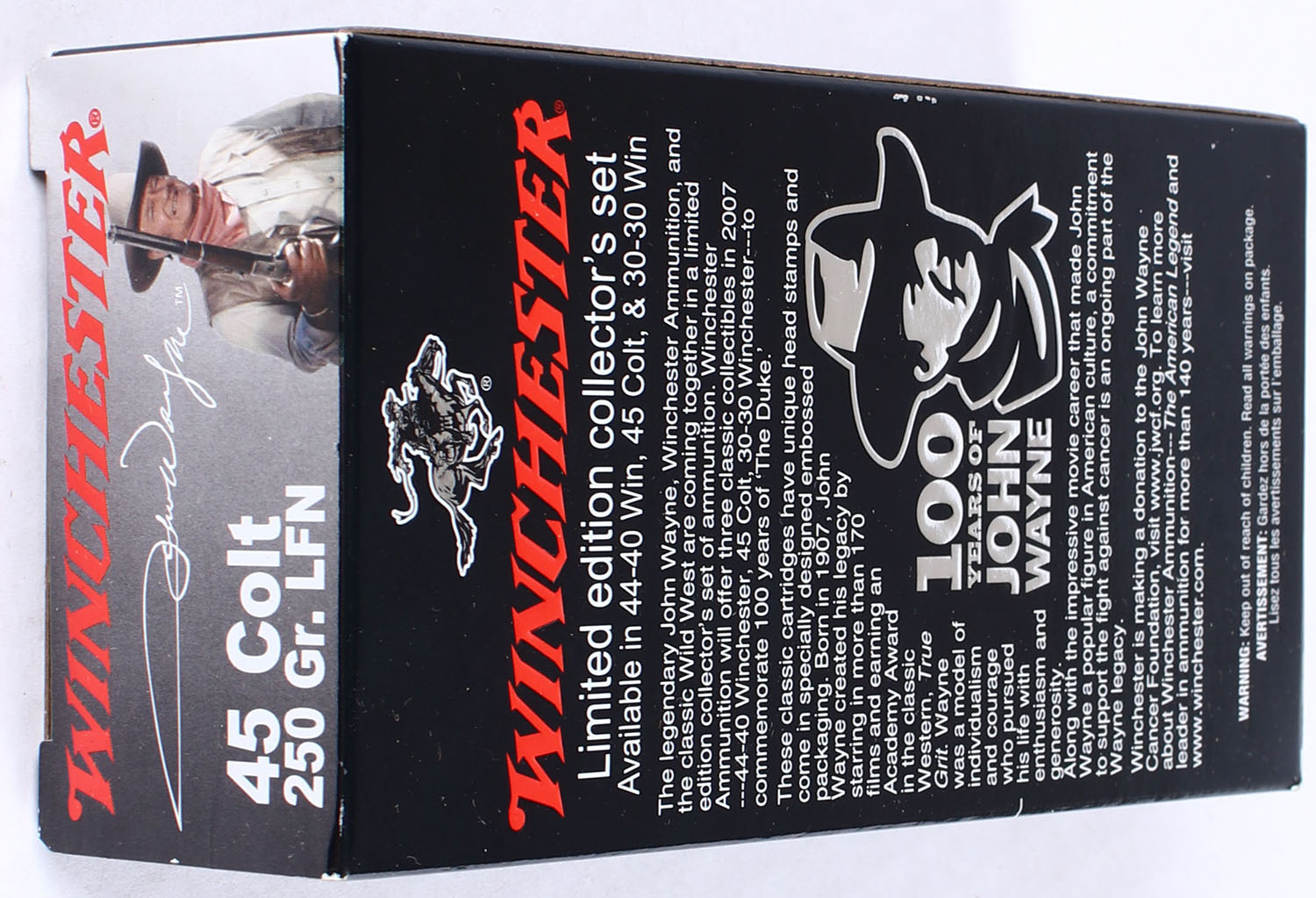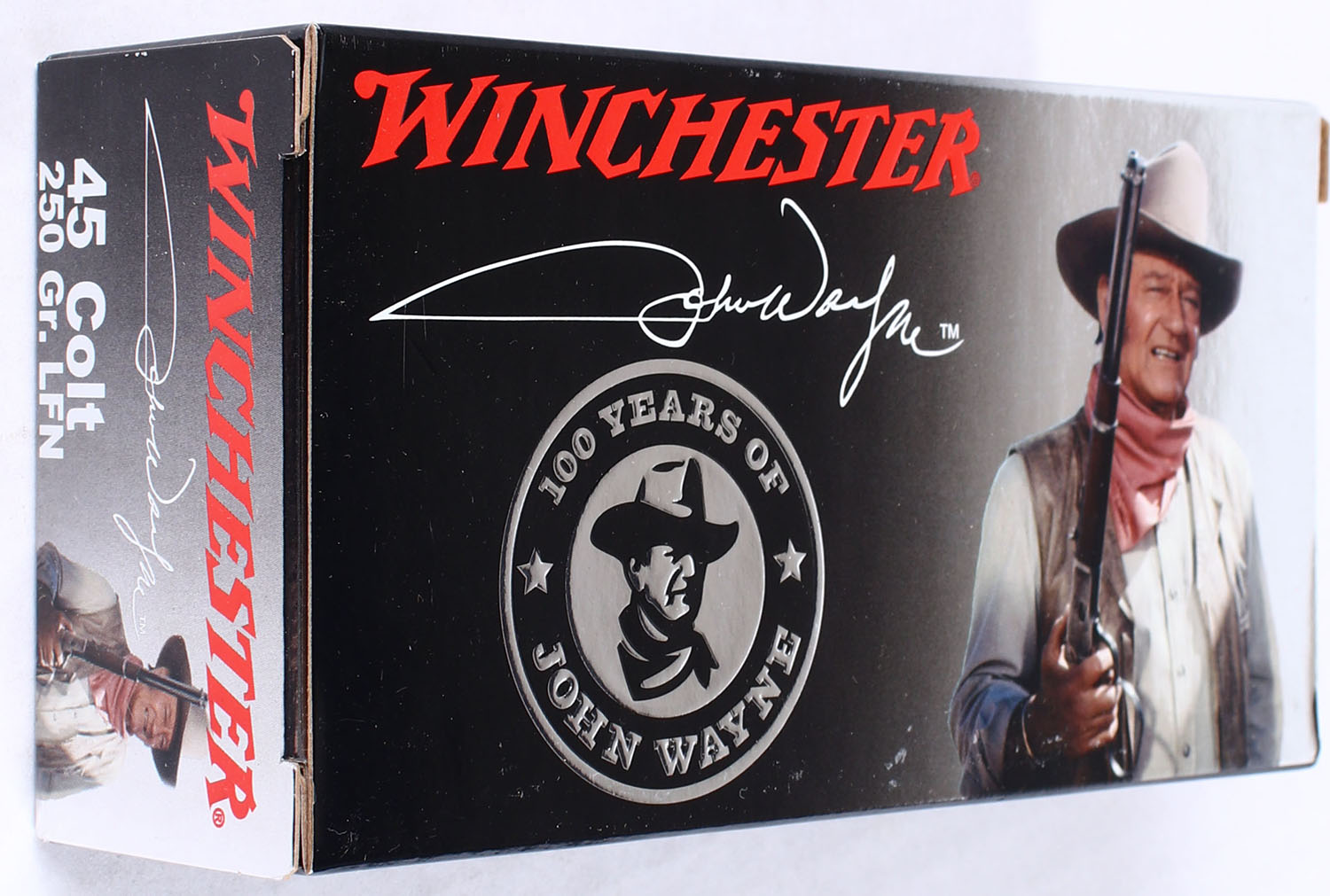 Winchester, 100 Years of John Wayne, .45 Colt, 250 Grain Lead Flat Nose, Full, 1pc. Multi-colored box, box is near mint with minty color, corners are sharp, edges are crisp, end flaps are solid, ammo is minty. Grade: MINT - Value: 80 to 120