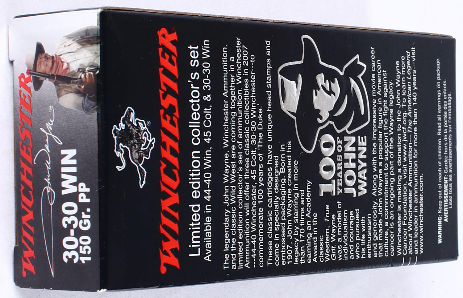 Winchester, 100 Years of John Wayne, .30-30 Winchester, 150 Gr. PP, Full, 1pc. Black silver & red box, box is MINT with minty color, corners are sharp, edges are crisp, end flaps are solid, ammo is minty. Grade: MINT - Value: 60 to 90