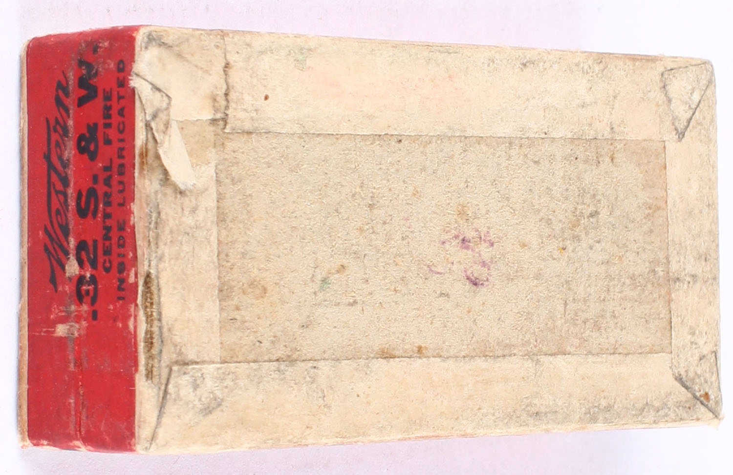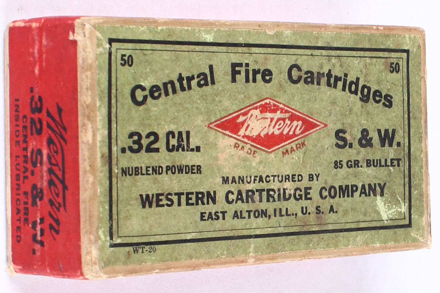 Western, Central Fire Cartridges, .32 Smith & Wesson, Nublend Powder, 85 Grain Bullet, FULL & SEALED, 2pc. Buff box with green top & red side sealing labels, box has scuffing with light age soiling, has edge wear, labels are intact. Grade: Vey Good ++ - Value: 40 to 60