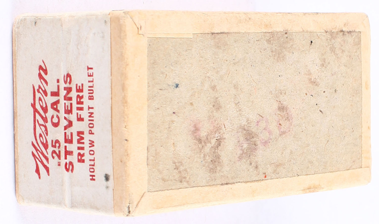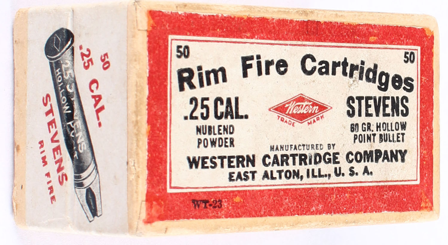 Western, Rim Fire Cartridges, .25 Stevens, Nublend Powder, 60 Grain H.P., FULL & SEALED, 2pc. Buff box with buff & red top with white sealing label, box is very solid with excellent color, box has light shelf wear with minor scuffing. Grade: Excellent + - Value: 200 to 300