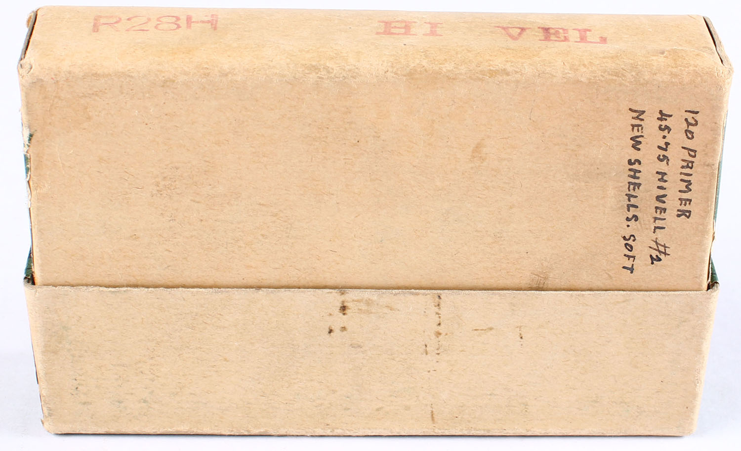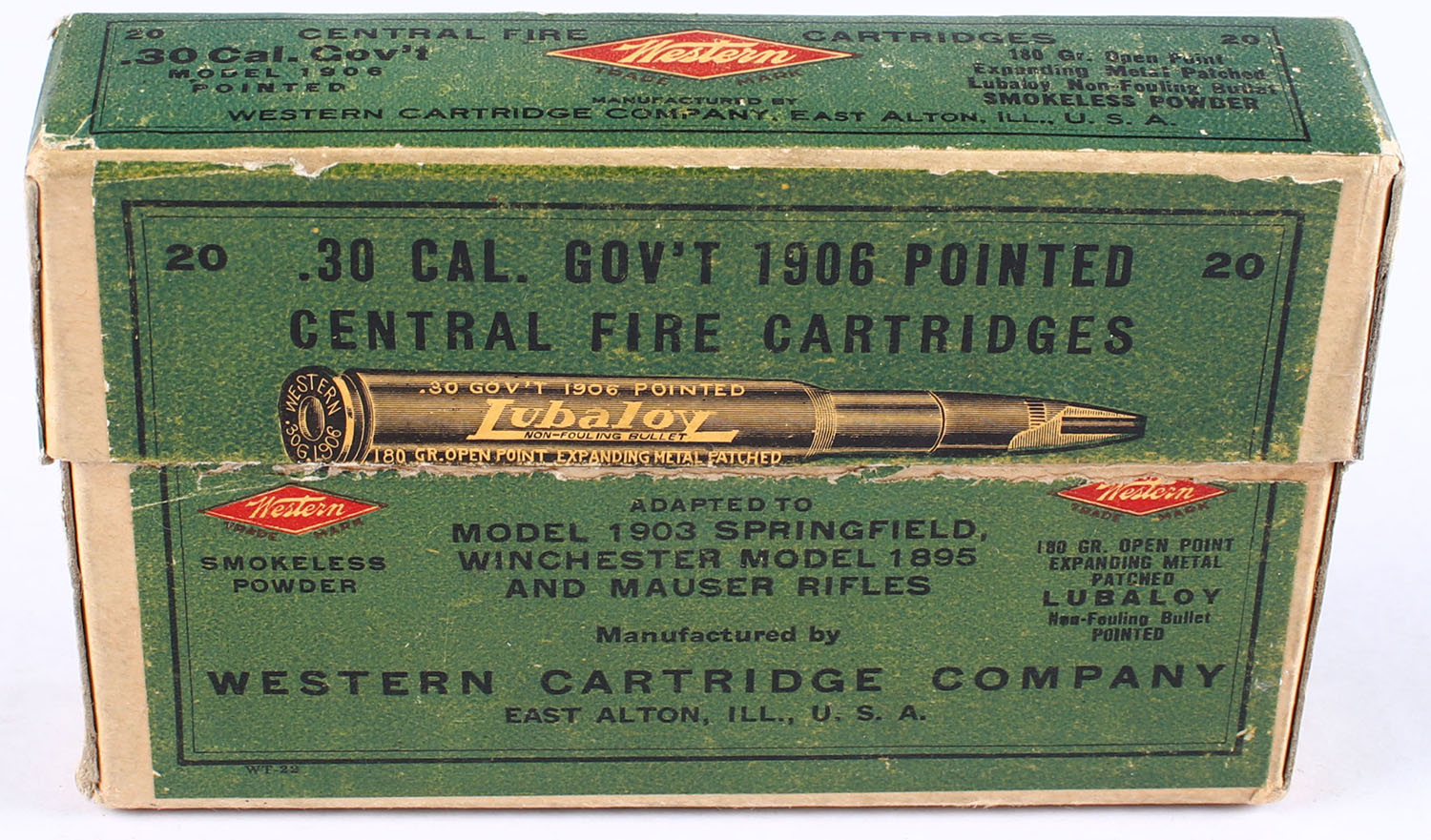 Western, Center Fire Cartridges, .30 Cal Government 1906 (.30-06), Full, 2pc. Buff box with green labels, box is solid with great color, box has light scuffing & edge wear, label is intact, back has been written on, ammo is excellent. Grade: Very Good ++ - Value: 34 to 50