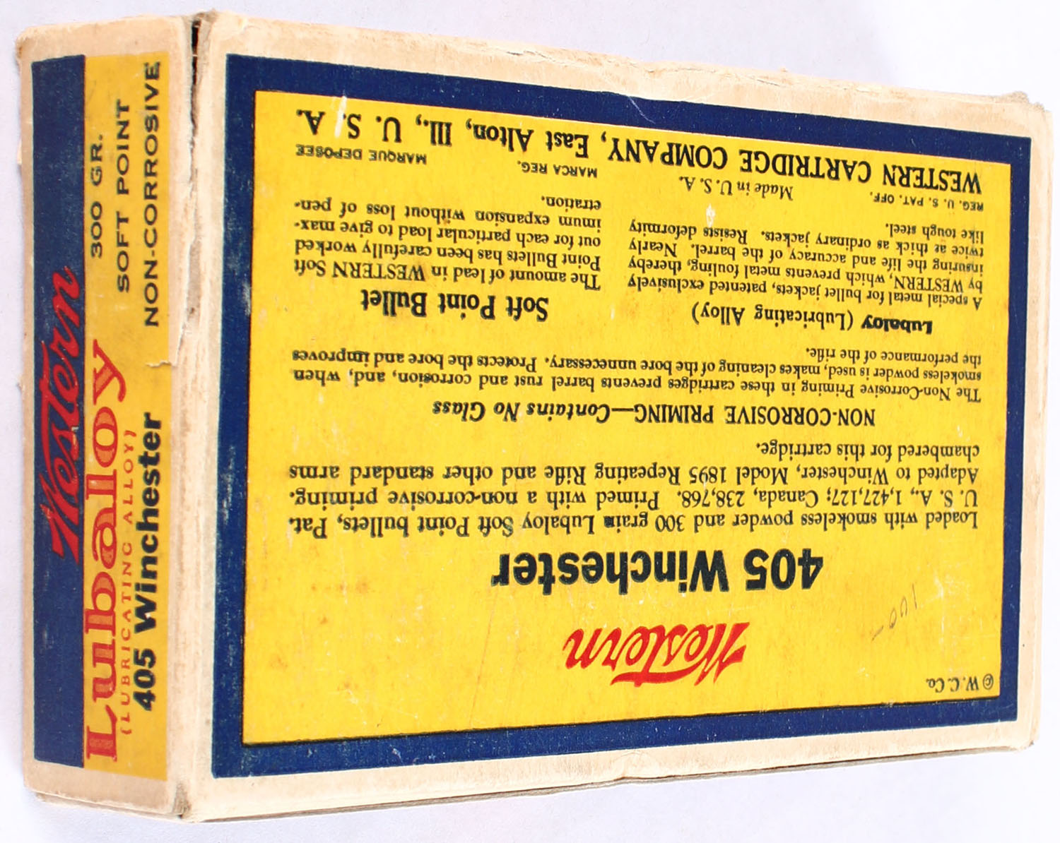 Western, Lubaloy Cartridges, .405 Winchester, 300 Grain Soft Point, Full, 1pc, Yellow blue & red bulls eye box, box is solid with very good color, has light shelf wear with corner wear, has a partial seam split to right end flap, ammo is very good. Grade: Very Good ++ - Value: 70 to 100
