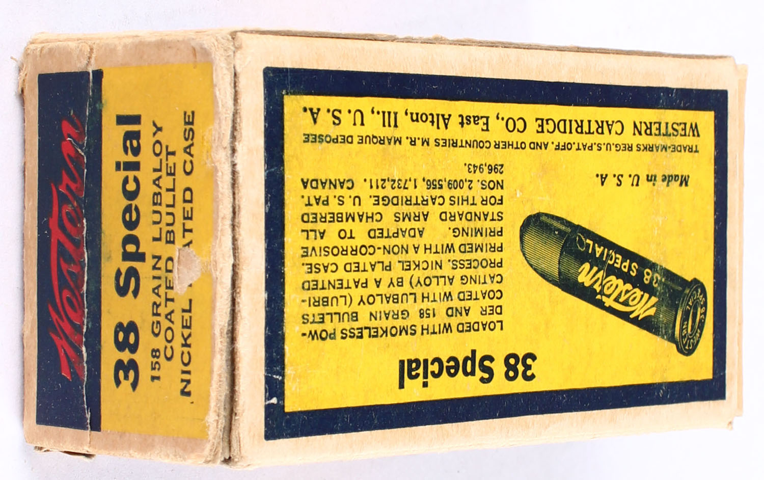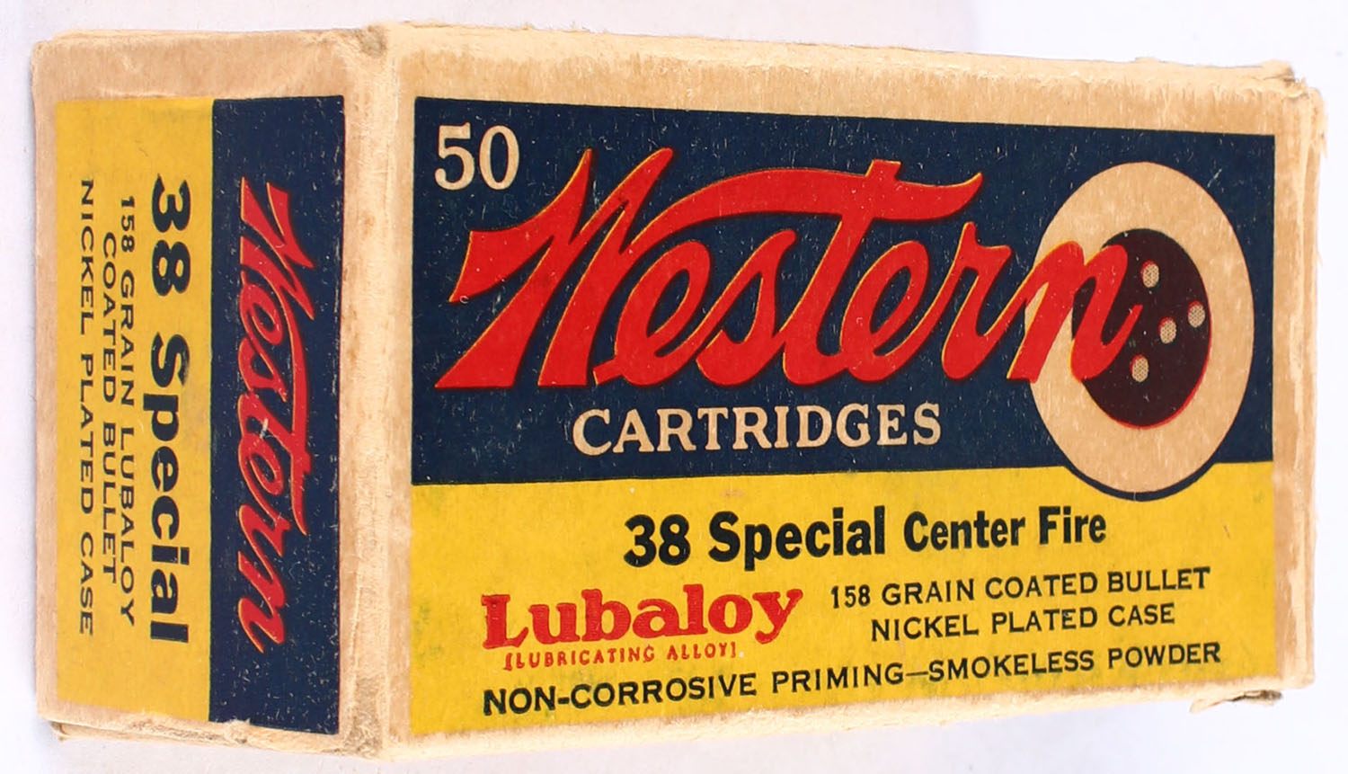 Western, Lubaloy Cartridges, .38 Special, 158 Grain Lubaloy Bullet, Full, 1pc. Yellow blue & red bulls eye box, box has shelf & edge wear, box is missing right inside flap, has light scuffing with very good color, ammo is excellent. Grade: Very Good - Value: 40 to 60