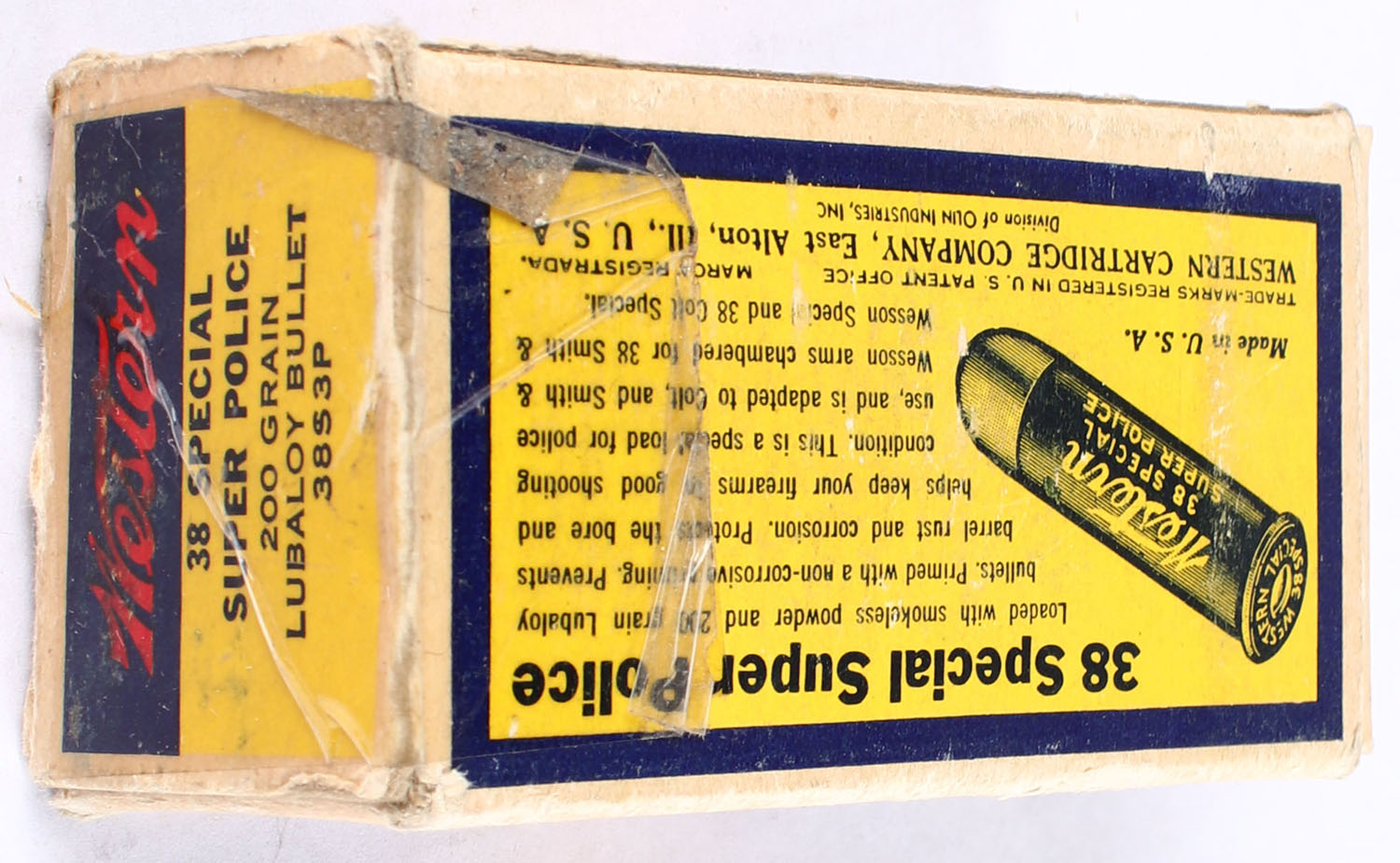 Western, Lubaloy Cartridges, .38 Special Super Police, 200 Grain Coated Bullet, Partial 44rds., 1pc. Yellow blue & red bullseye box, right end flap has tape repair to seam split, has corner & edge wear with a partial tear to front, box has very good to excellent color, ammo is very good to excellent. Grade: Good ++ - Value: 30 to 45