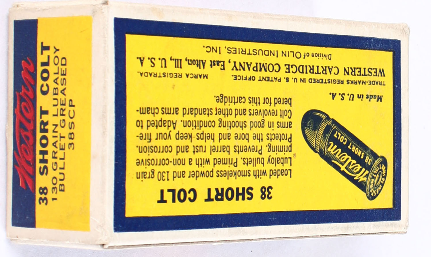 Western Lubaloy Cartridges, .38 Short Colt, 130 Grain Lubaloy Greased Bullet, Full, 1pc., Blue yellow & red bulls eye box, box is very solid with excellent color, corners are mostly sharp, edges are mostly crisp, ammo is excellent. Grade: Excellent + - Value: 50 to 75