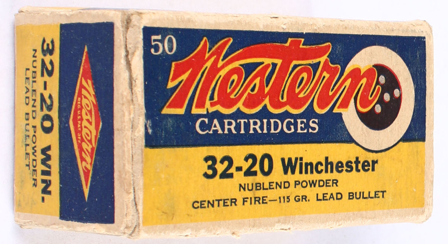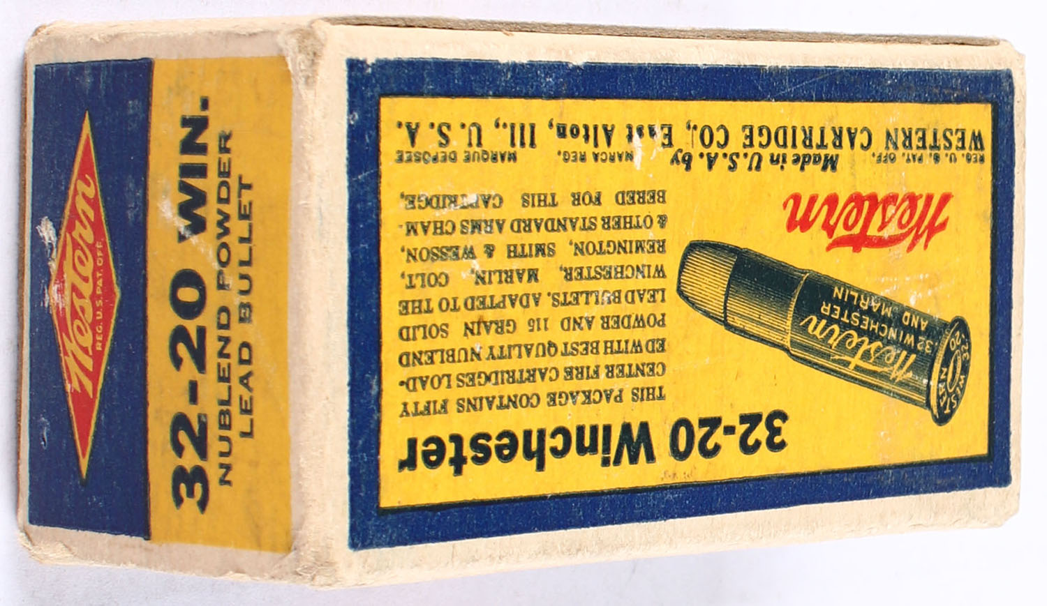 Western, Center Fire Cartridges, GHOST BOX, 32-20 Winchester, 115 Grain Nublend Powder Lead Bullet, Full, 1pc., Blue yellow & red box, box has shelf wear with edge & corner wear, end flaps are solid, ammo is excellent. Grade: Very Good - Value: 70 to 100