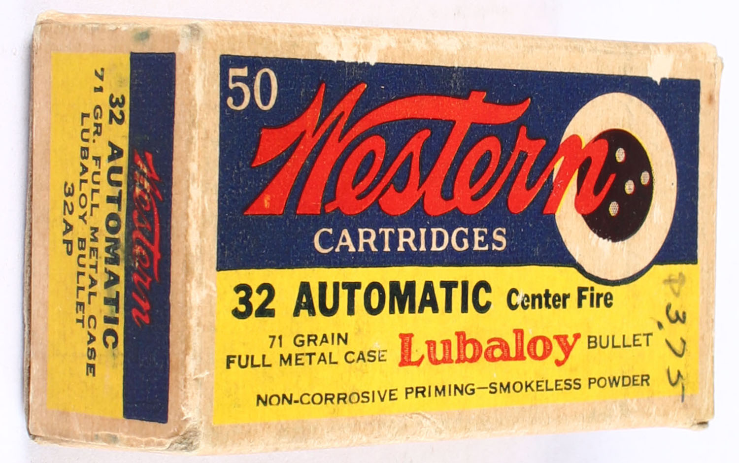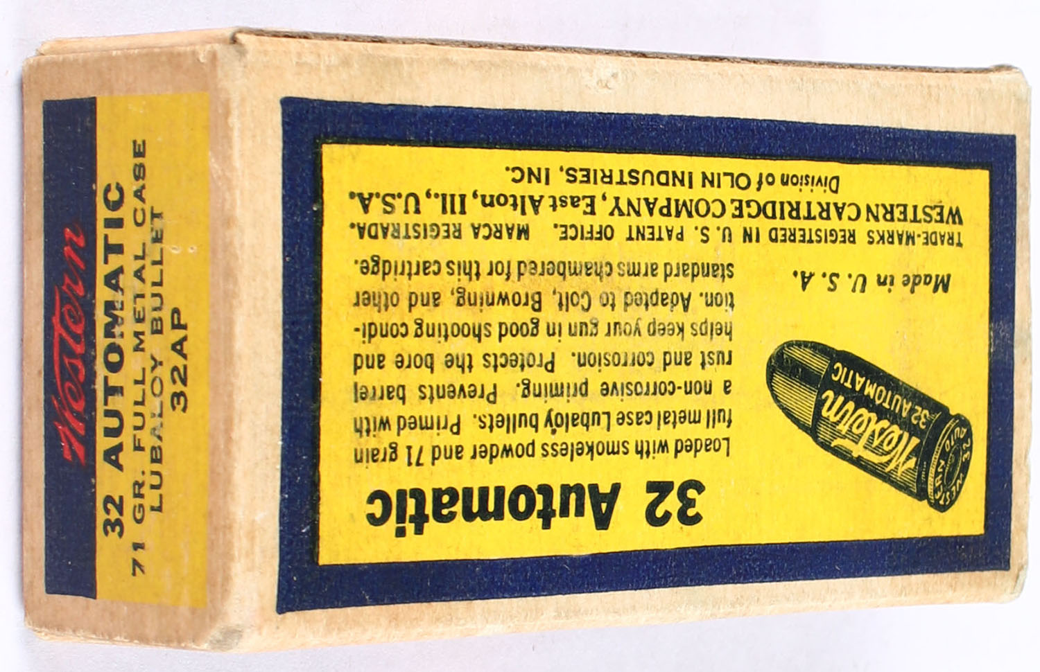Western, Lubaloy Cartridges, .32 Automatic, 71 Grain Full Metal Case Bullets, Partial 44rds, 1pc. Yellow blue & red bulls eye box, box is solid with excellent color, some shelf & edge wear, light corner wear, end flaps are solid, ammo is excellent. Grade: Very Good ++ - Value: 20 to 30