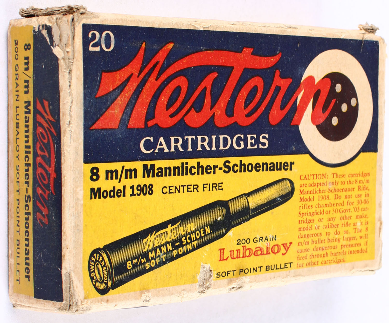 Western, Lubaloy Cartridges, 8mm Mannlicher-Schoenauer, 200 Grain Soft Point Bullet, Full, 1pc. Yellow blue & red bulls eye box, box has scuffing with edge & corner wear, has missing inside flaps, end flaps have a partial seam split, ammo is excellent. Grade: Very Good - Value: 30 to 45