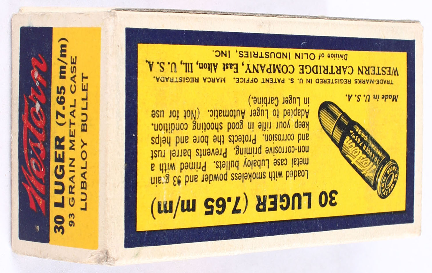 Western, Lubaloy Cartridges, .30 Luger (7.65mm), 93 Grain Metal Case Bullet, Full, 1pc. Blue yellow & red bulls eye box, box is very solid with excellent color, end flaps are solid, ammo is excellent. Grade: Excellent + - Value: 40 to 60