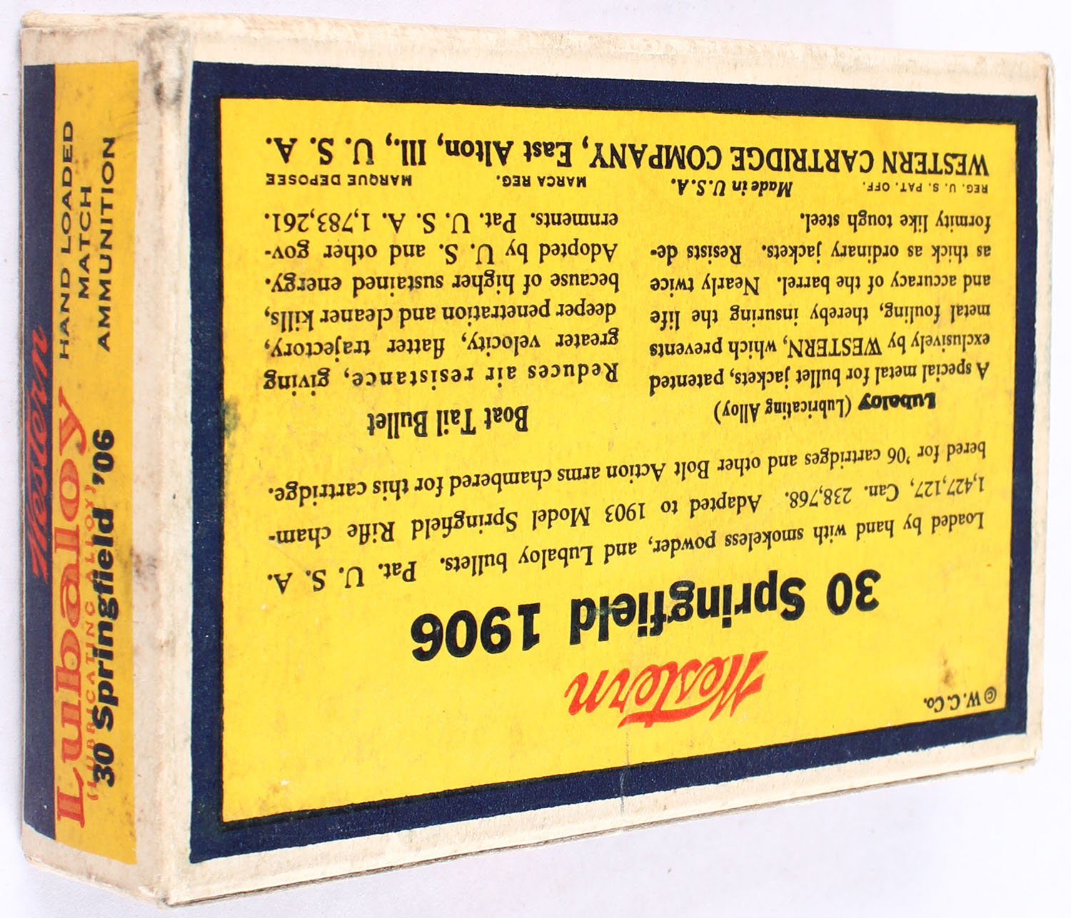 Western, .30 Springfield 1906, Handloaded match ammo., Full, 1Pc., Blue yellow & red bulls eye box, box has some scuffing & minor corner wear, end flaps are solid, ammo is excellent. Grade: Excellent - Value: 34 to 50