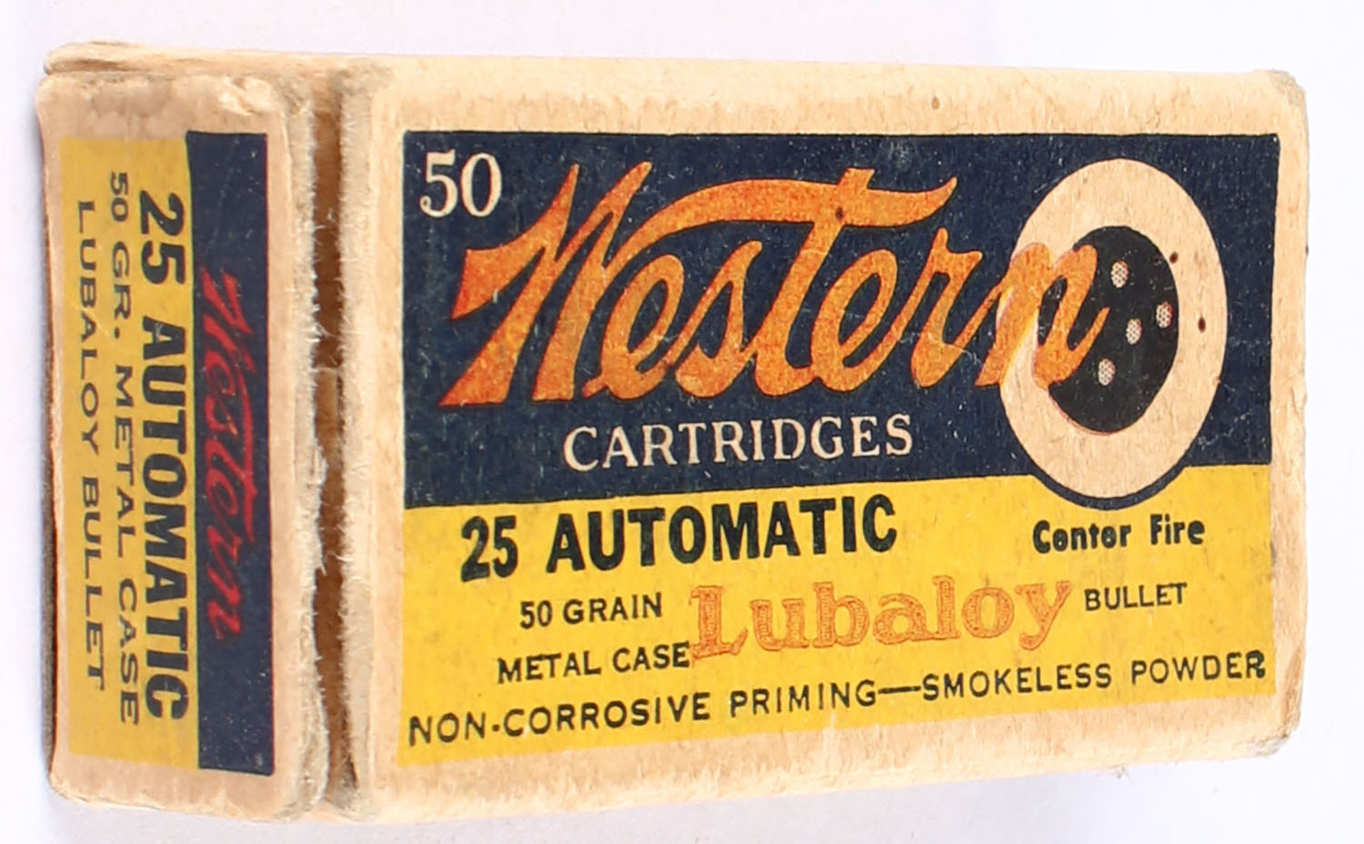 Western, Lubaloy Cartridges, .25 Automatic, 50 Grain Full Metal Case Bullet, Partial 31rds., 1pc. Yellow blue & red bulls eye box, box is solid with good color, some color fading to top, minor corner wear & edge wear, end flaps have seam splits & have tape repairs, ammo is excellent. Grade: Good ++ - Value: 18 to 27