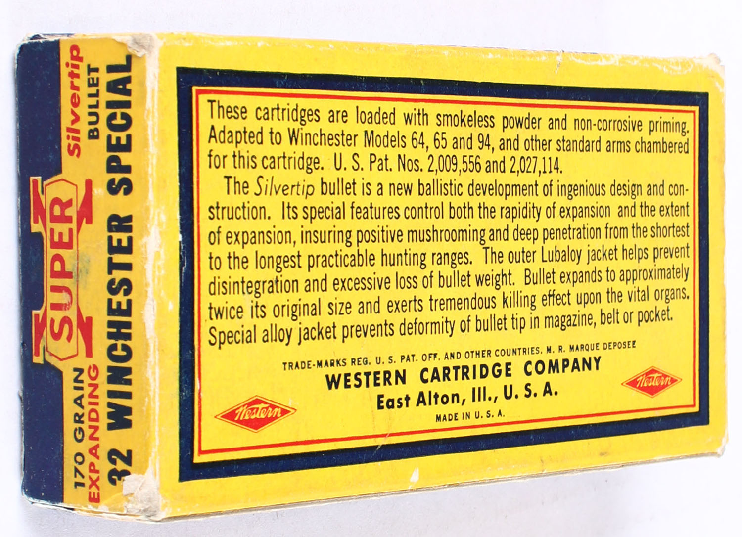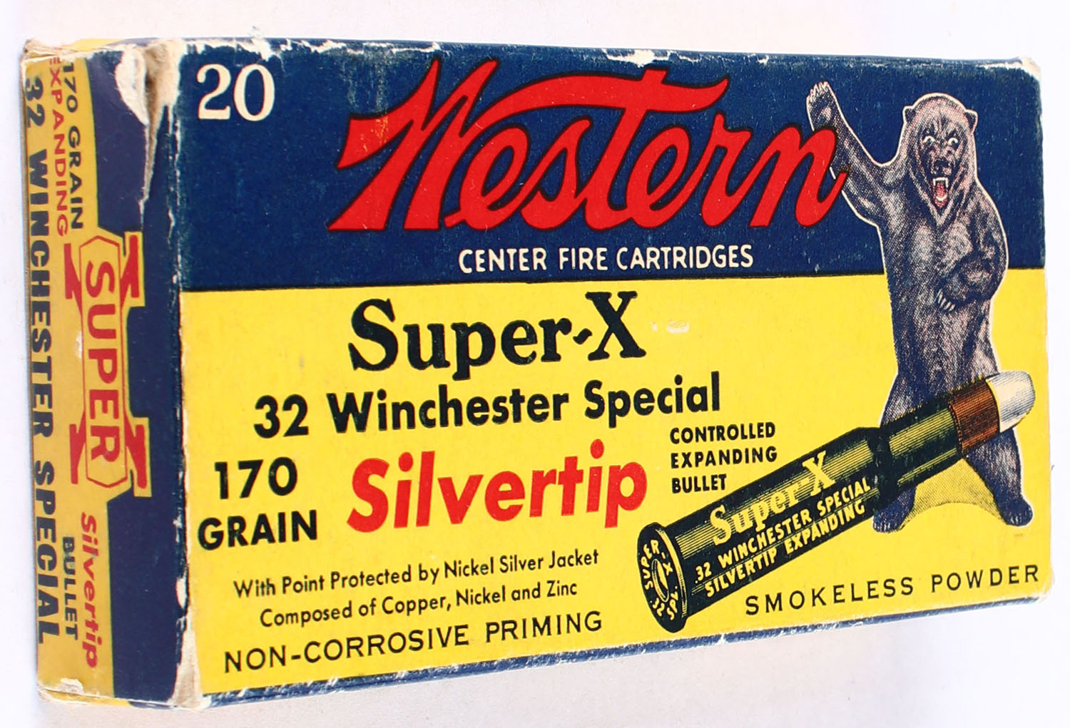 Western, Silvertip, .32 Winchester Special, 170 Grain Silvertip Bullet, Controlled Expanding Bullet, Full, 1pc. Yellow blue & red Bear Box, box has very good to excellent color, has edge & corner wear, end flaps are solid, ammo is excellent. Grade: Very Good ++ - Value: 60 to 100