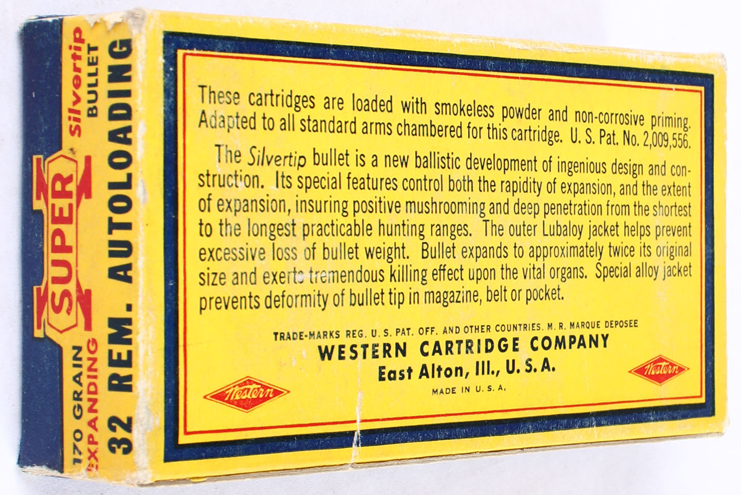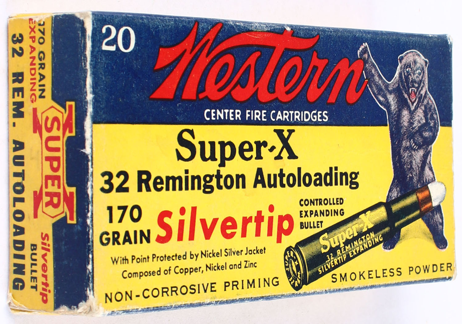 Western, Super-X Silvertip, .32 Remington Autoloading, 170 Grain Silvertip bullet, 1pc, Full, Yellow blue & red bear box, box is very solid with excellent color, has minor edge wear, end flaps are solid, ammo is excellent. Grade: Excellent - Value: 60 to 90