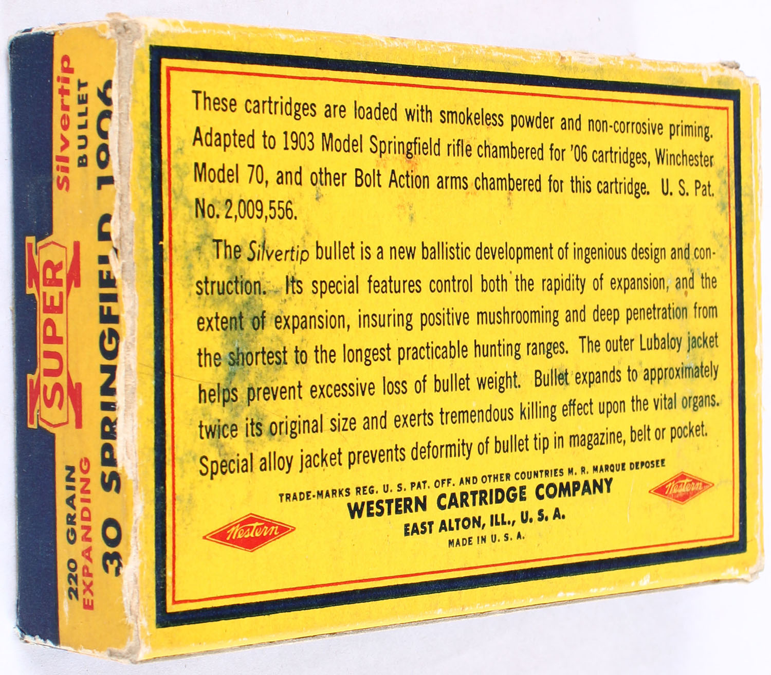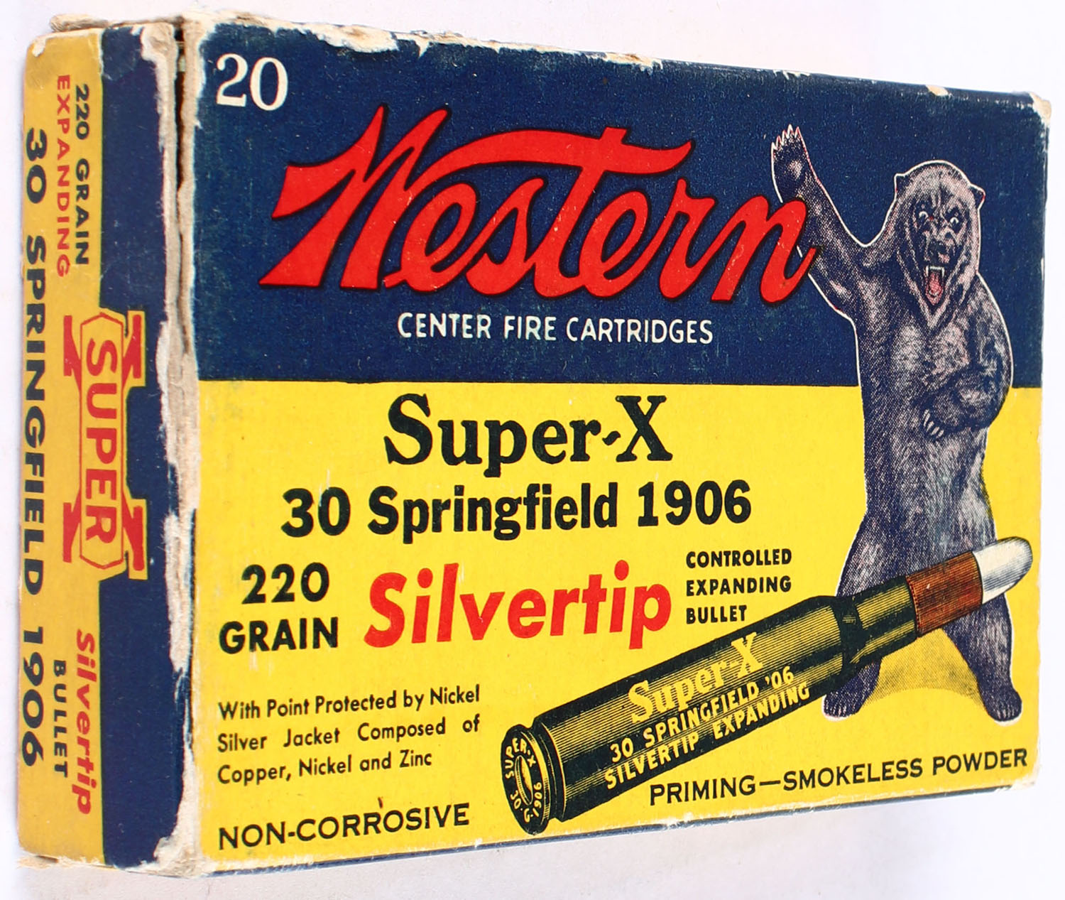 Western, Super-X Silvertip, .30 Springfield 1906 (.30-06), 220 Grain Controlled Expanding Bullet, Full, 1pc. Yellow blue & red bear box, box has edge & corner wear with a partial seam split to left flap, ammo is excellent. Grade: Very Good - Value: 60 to 90