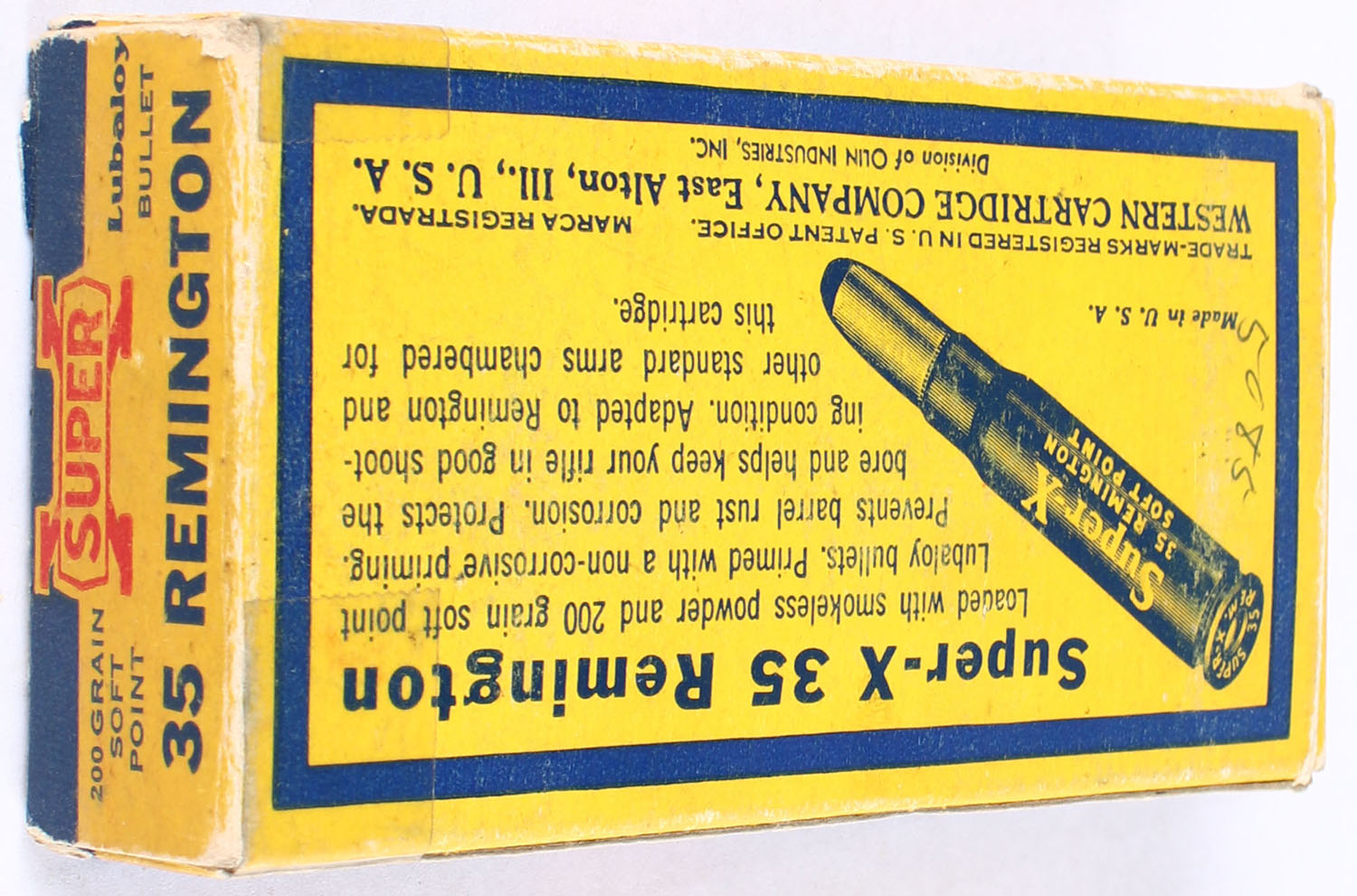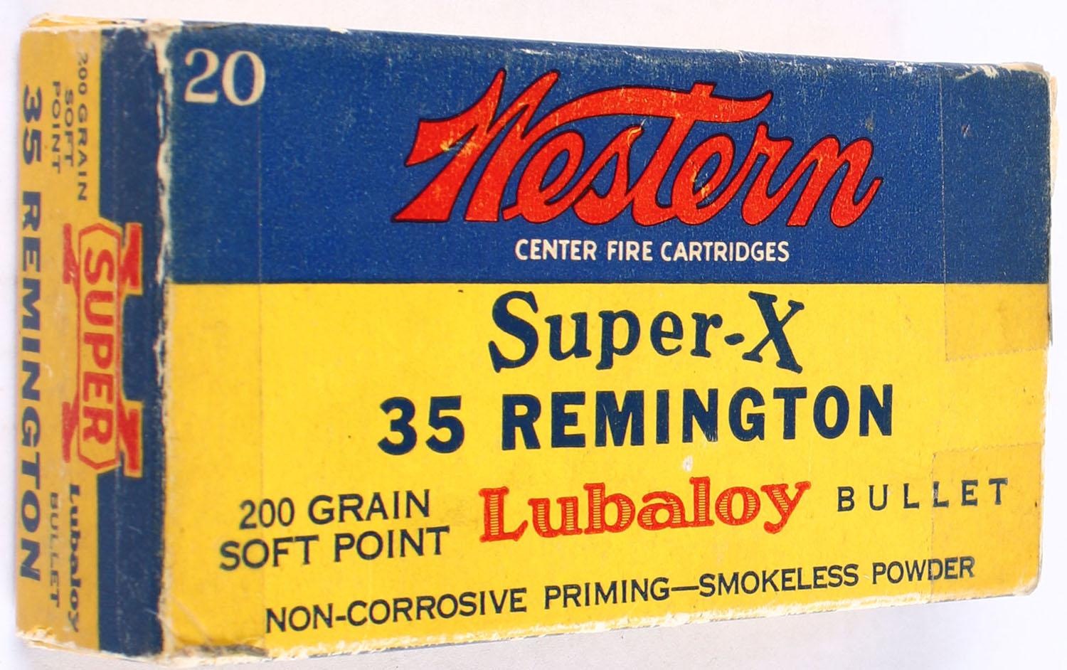 Western, Super-X, .35 Remington, 200 Grain Soft Point, Full, 1pc., Yellow blue & red box, box is solid with good color, has minor shelf wear & edge wear, has tape to end flaps, ammo is excellent. Grade: Very Good + - Value: 50 to 75