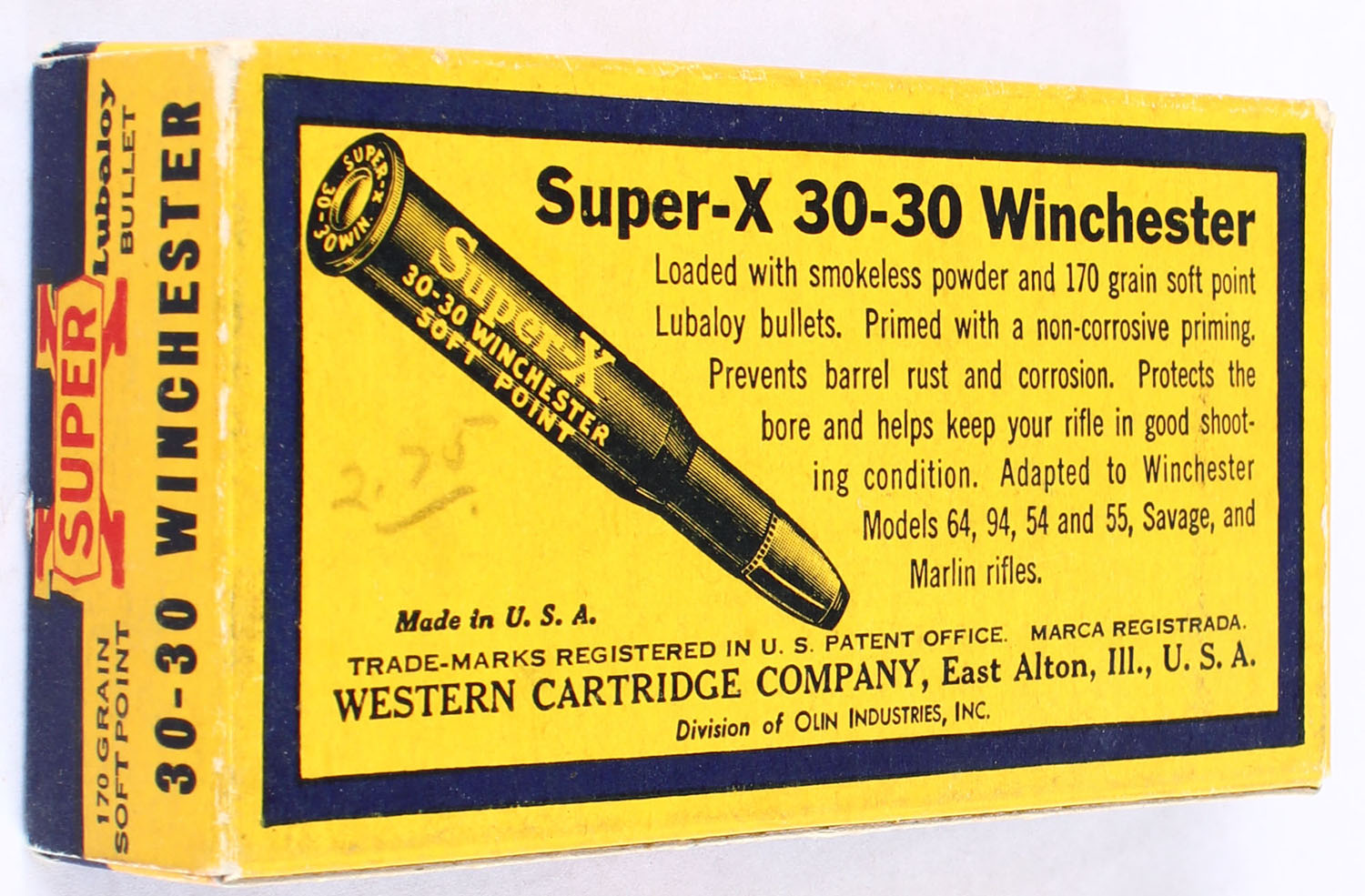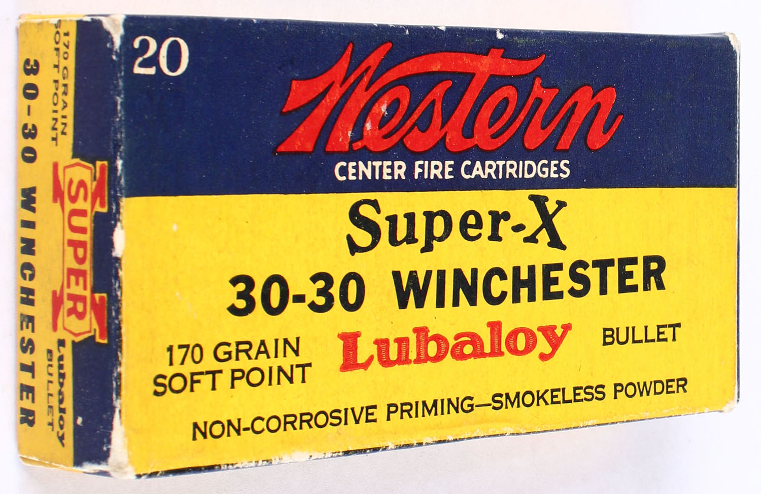 Western, Super-X, .30-30 Winchester, 170 Grain Soft Point Lubaloy Bullet, Full, 1pc. Yellow blue & red box, box is very solid with excellent color, very minor corner wear, end flaps are solid, ammo is excellent. Grade: Excellent - Value: 30 to 45