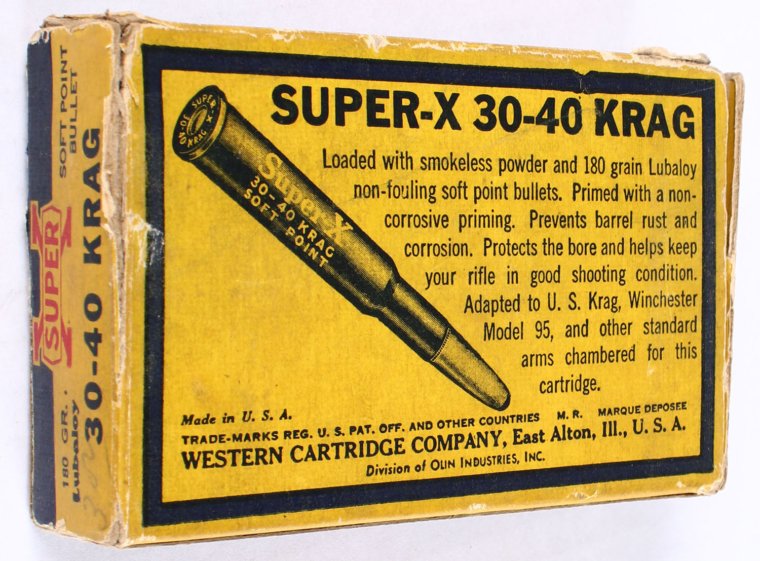 Western, Super-X, .30-40 Krag, 180 Grain Soft Point Lubaloy Bullet, Full with 19rds being correct, 1pc. Yellow blue & red box, box has shelf wear & corner wear, has scuffing with inside flaps missing, ammo is very good. Grade: Very Good - Value: 30 to 45