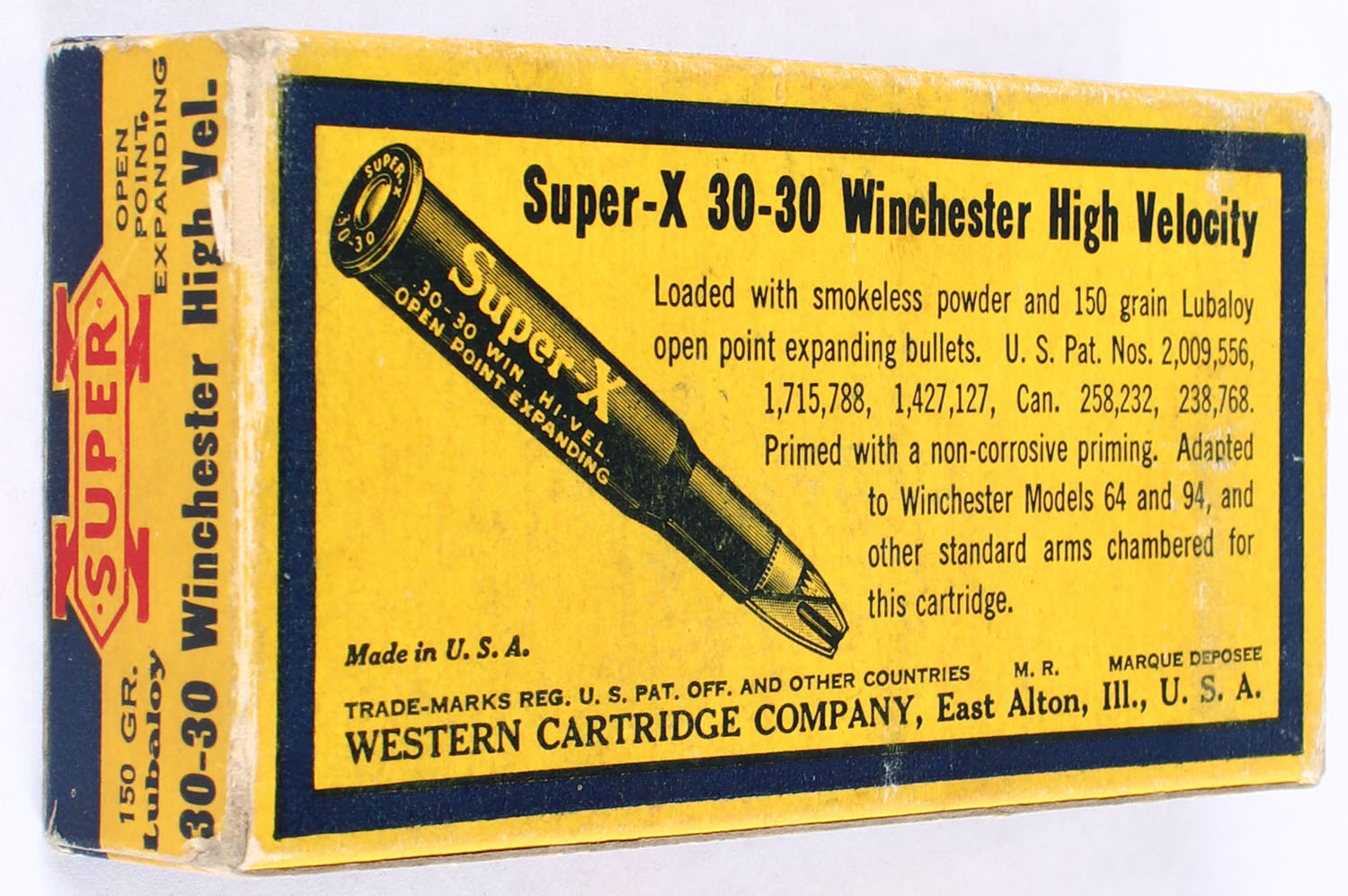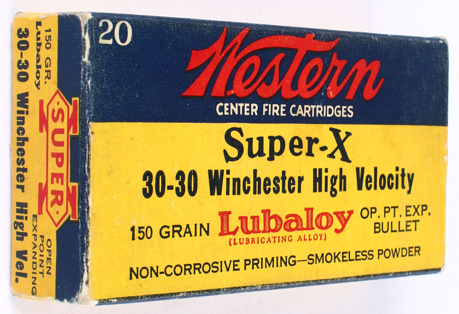 Western, Super-X, .30-30 Winchester High Velocity, 150 Grain Open Point Expanding Lubaloy Bullet, Full, 1pc. Yellow blue & red box, box is solid with excellent color, minor corner & edge wear, end flaps are solid, ammo is excellent. Grade: Excellent - Value: 30 to 45