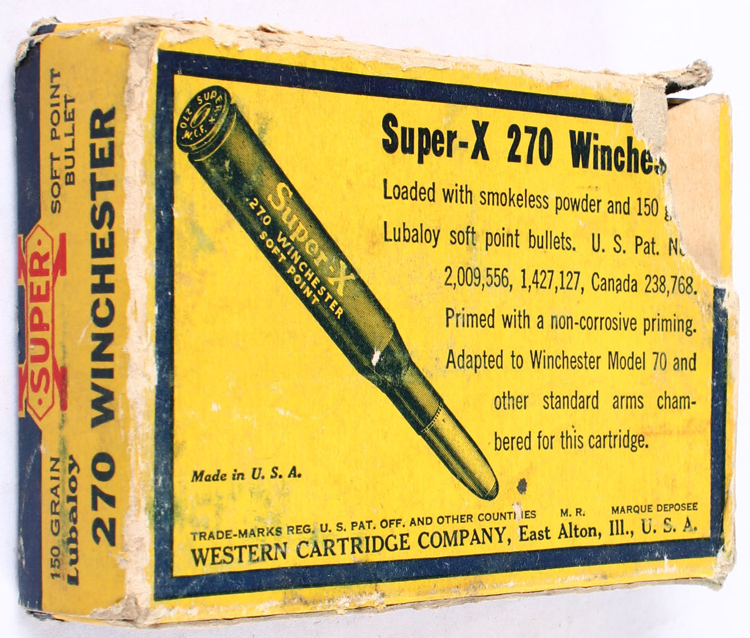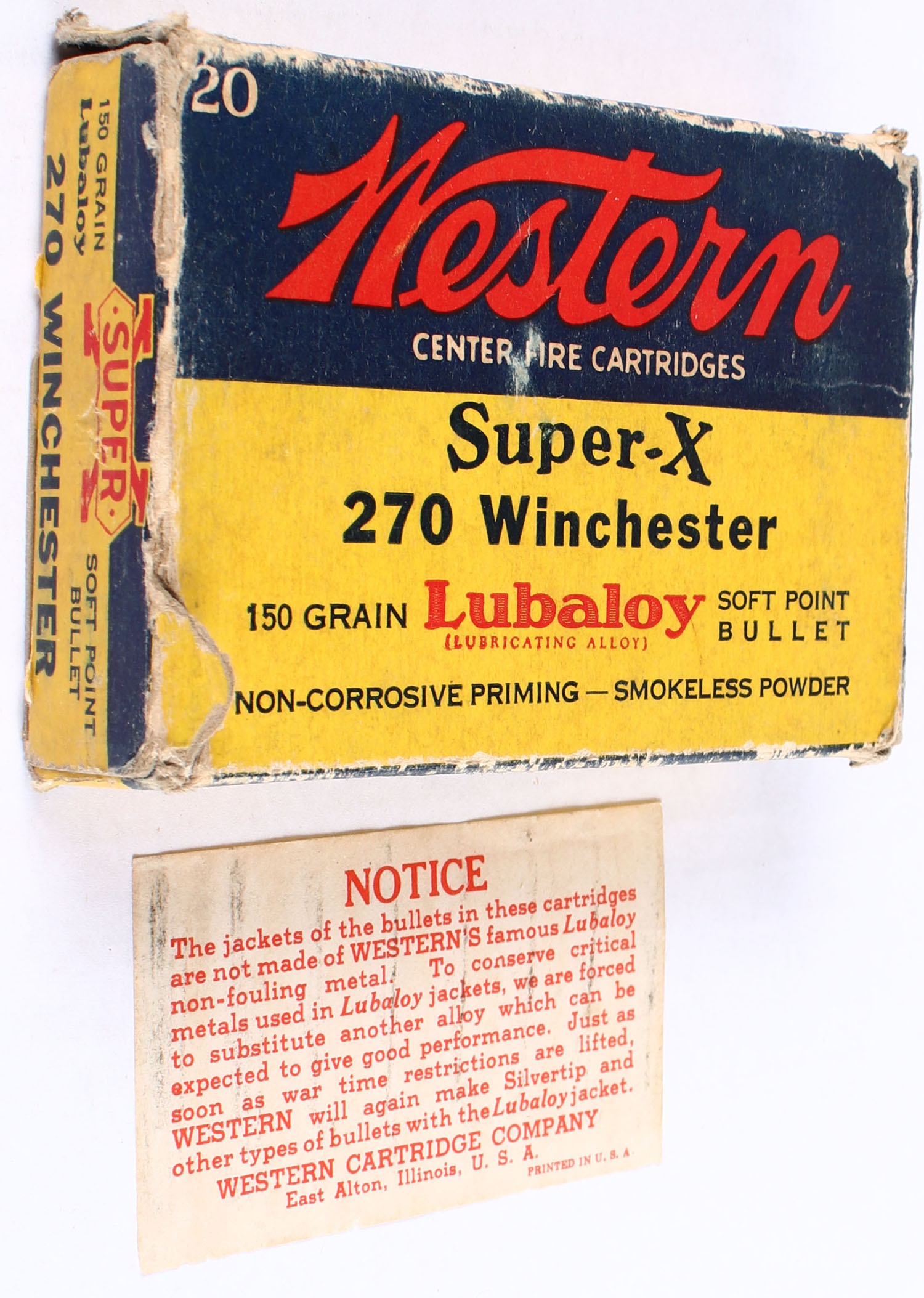 Western, Super-X, .270 Winchester, 150 Grain Soft Point Lubaloy Bullet, Full with Original Insert, 1pc. Yellow blue & red box, box has scuffing with edge & corner wear, has partial tear to bottom, end flaps are solid, ammo is very good. Grade: Good ++ - Value: 24 to 36