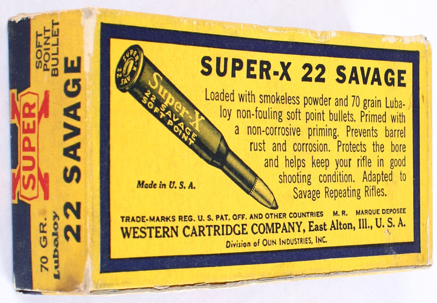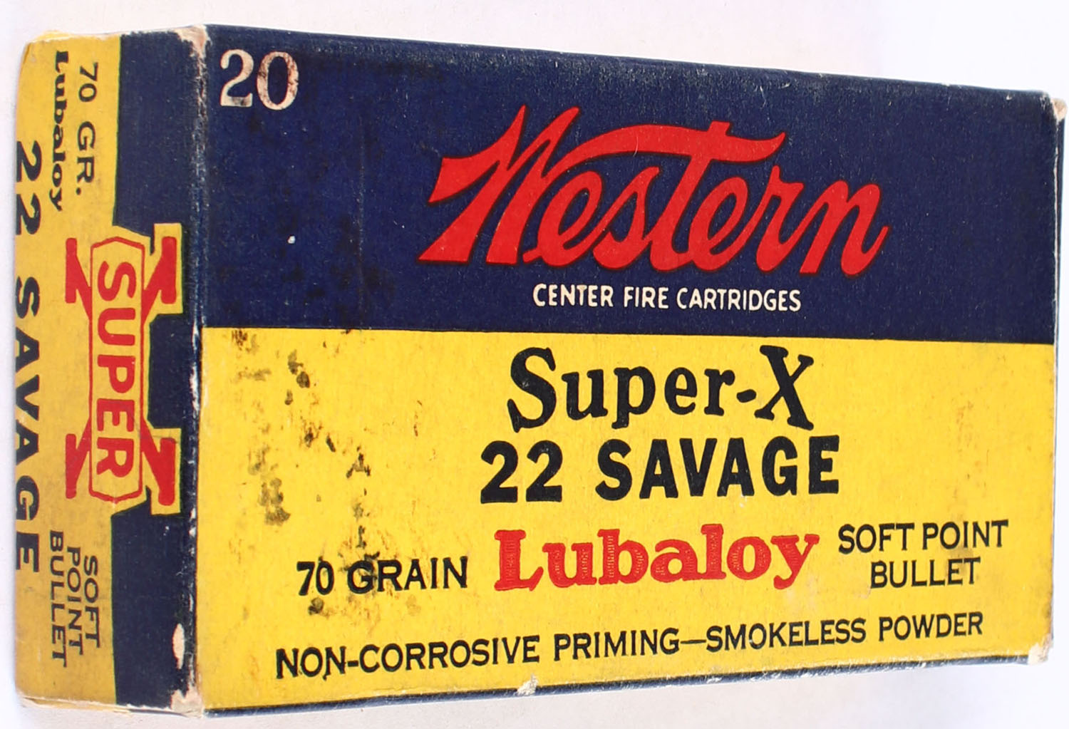 Western, Super-X, .22 Savage, 70 Grain Lubaloy Soft Point, Full, 1pc. Yellow blue & red box, box is solid with excellent color, minor corner & edge wear with light scuffing, end flaps are solid, ammo is excellent. Grade: Very Good ++ - Value: 80 to 120