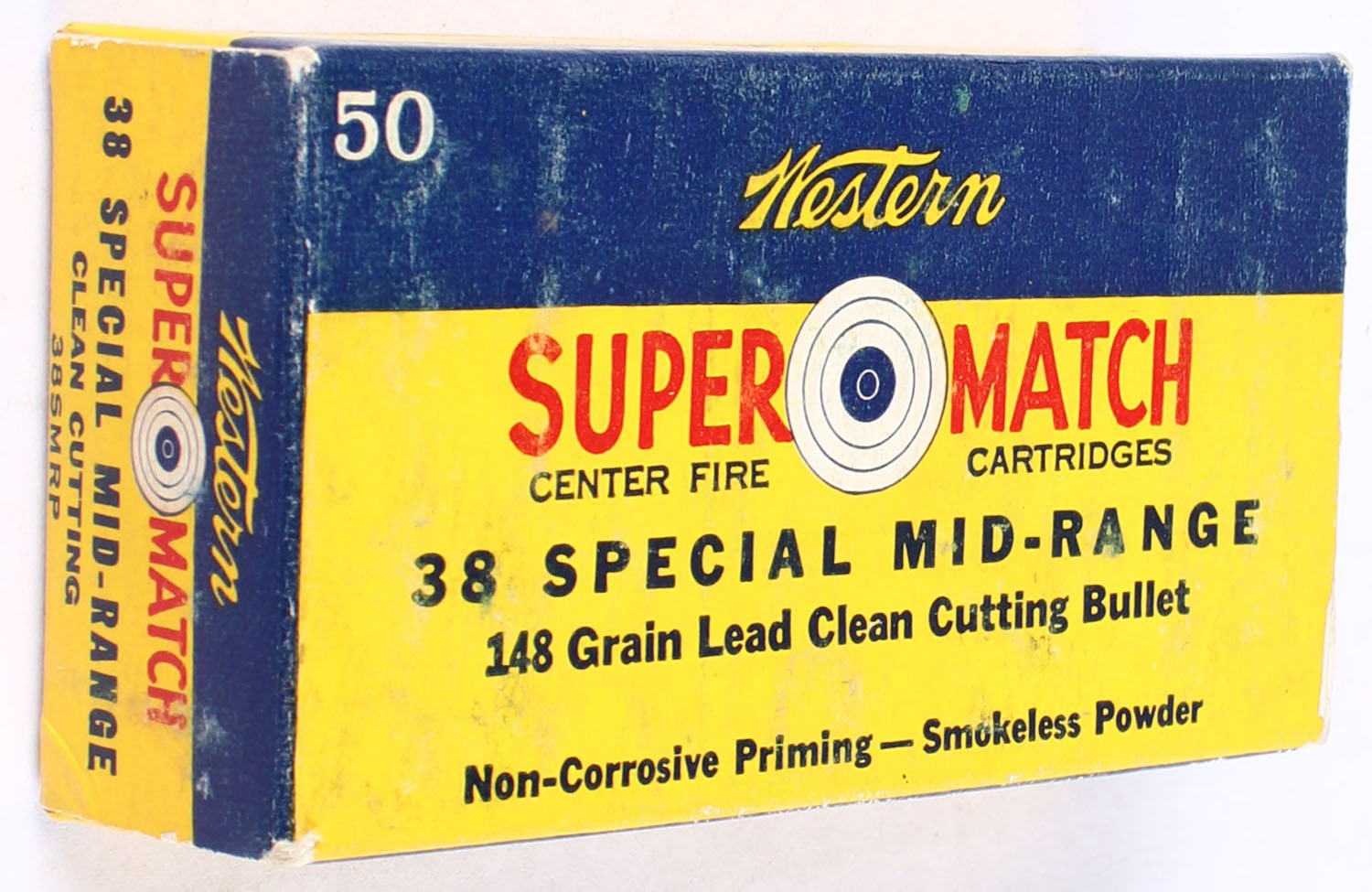 Western, Super Match, .38 Special Mid-Range, 148 Grain Lead Clean Cutting Bullet, Full, 1pc. Yellow blue & red box, box is solid with excellent color, minor scuffing, end flaps are solid, ammo is excellent. Grade: Excellent + - Value: 26 to 40