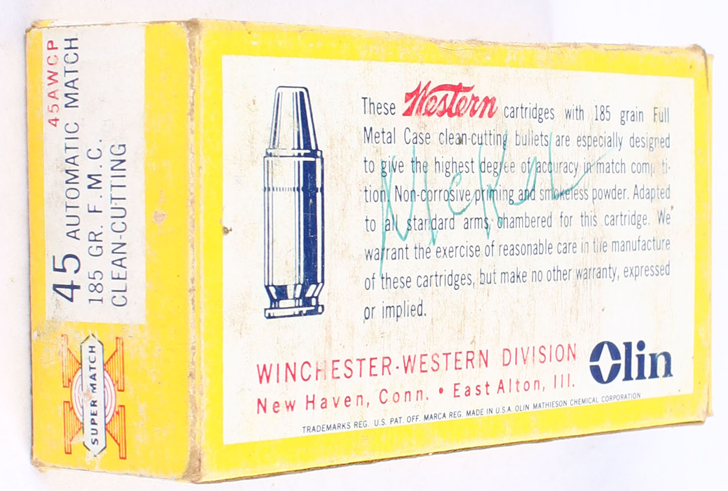 Western, Super-Match, .45 Automatic, 185 Grain Full Metal Clean-Cutting, Full, 1pc. Yellow white & red box, box has scuffing with light edge & corner wear, end flaps are solid, ammo is excellent to minty. Grade: Very Good ++ - Value: 24 to 36