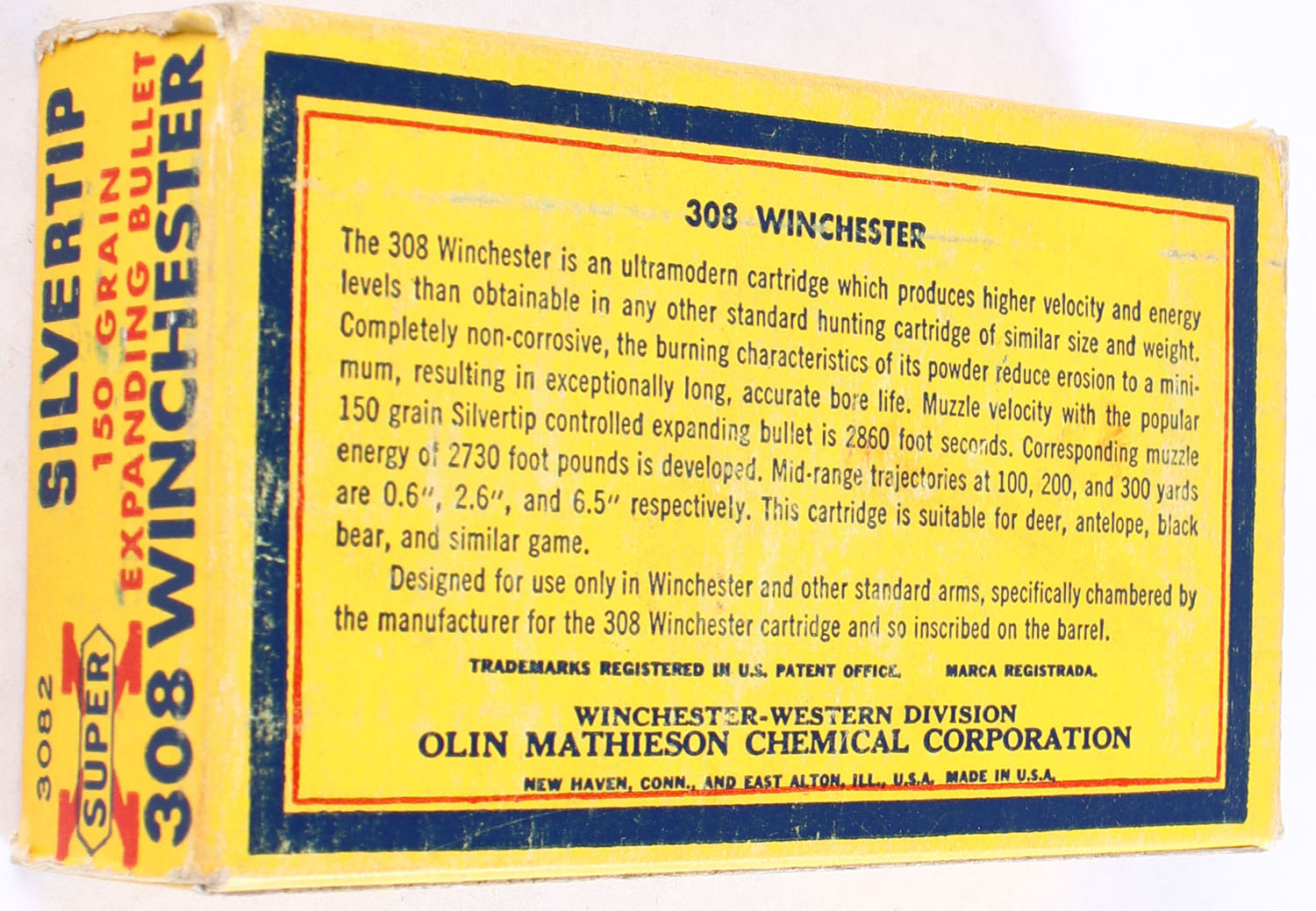 Western, Super X Silvertip, .308 Winchester, 150 Grain Controlled Expanding Bullet, Full, 1pc. Yellow blue & red box, box is solid with excellent color, very minor age soiling, minor corner & edge wear, end flaps are solid, ammo is excellent. Grade: Excellent - Value: 40 to 60