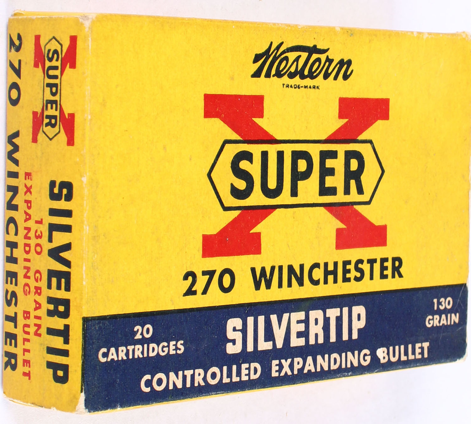 Western, Super-X Silvertip, .270 Winchester, 130 Grain Controlled Expanding Bullet, Full, 1pc. Yellow blue & red box, box is very solid with excellent color, end flaps are solid, ammo is excellent. Grade: Very Good ++ - Value: 30 to 45