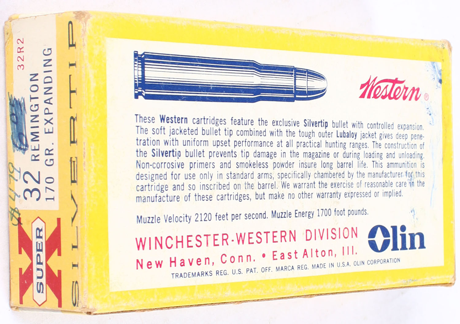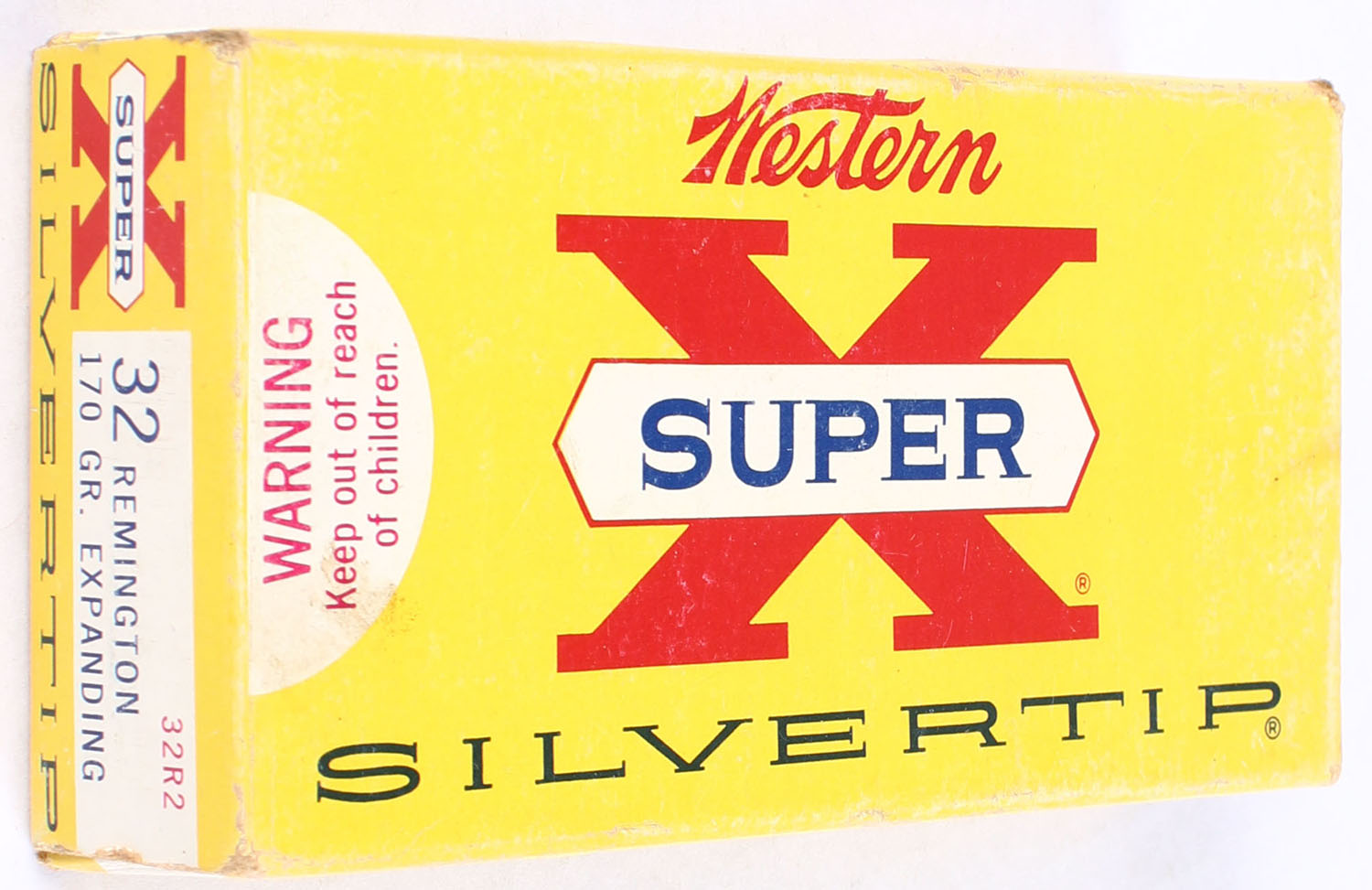 Western, Super X Silvertip, .32 Remington, 170 Grain Expanding Bullet, Full, 1pc. Yellow white & red box, box is solid with excellent color, minor shelf wear, minor edge & corner wear, end flaps are solid, ammo is excellent. Grade: Very Good ++ - Value: 60 to 90