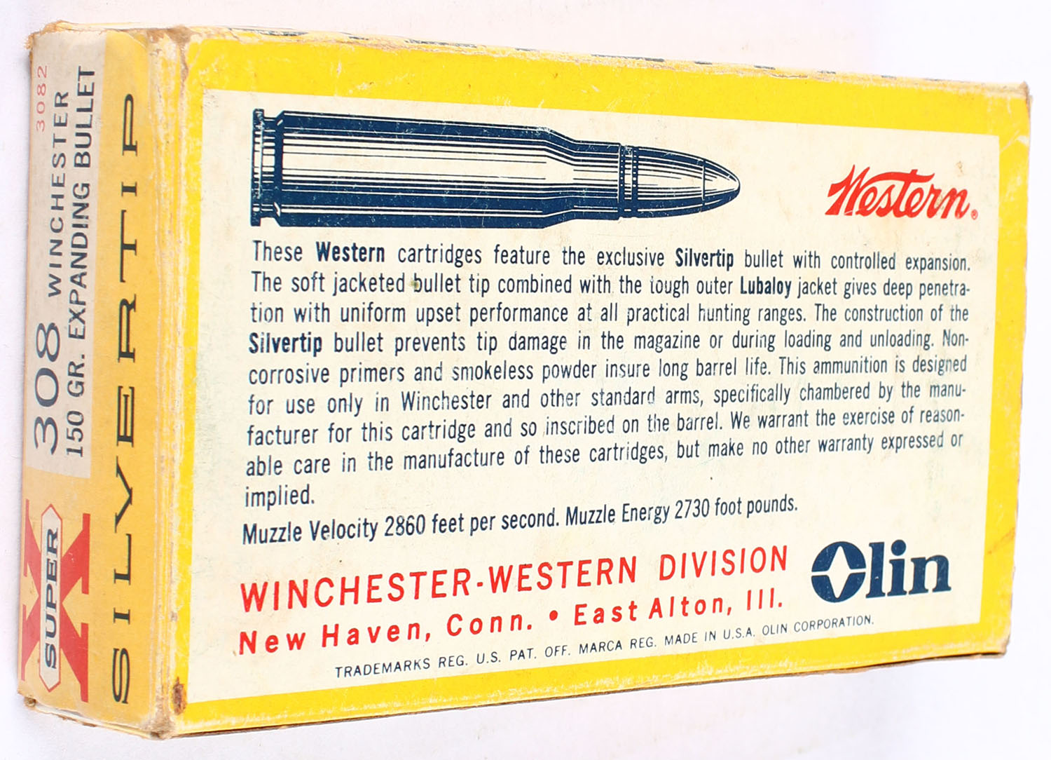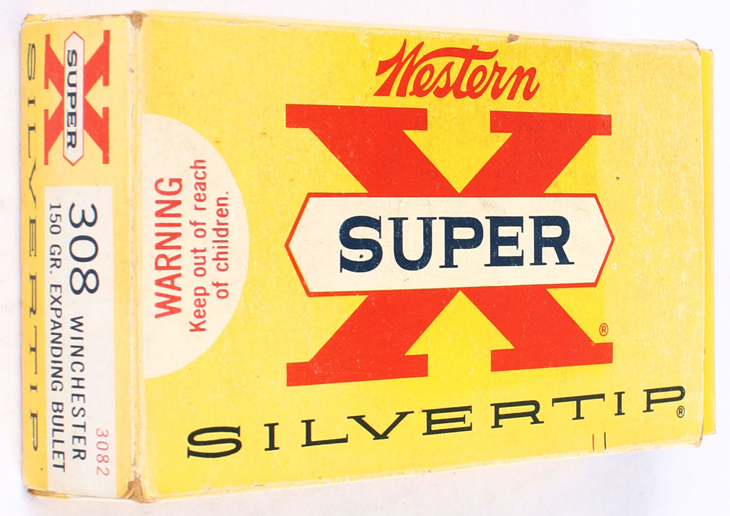 Western, Super X Silvertip, .308 Winchester, 150 Grain Expanding Bullet, Full with mixed ammo, 1pc. Yellow white & red box, box is solid with some shelf wear, has rub marks, end flaps are solid, ammo is very good. Grade: Very Good - Value: 24 to 36