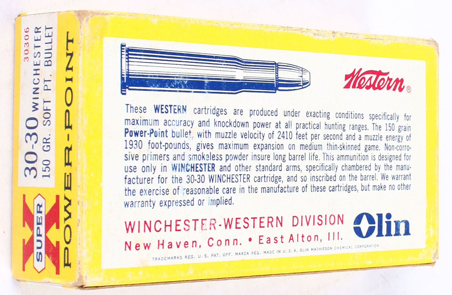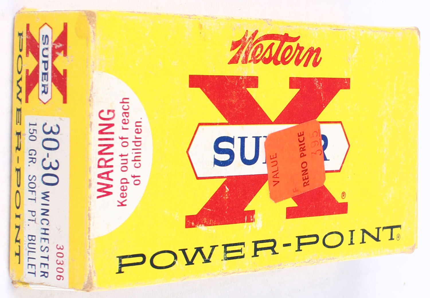 Western, Power-Point, .30-30 Winchester, 150 Grain Soft Point Bullet, Full, 1pc. Yellow white & red box, box is solid with excellent color, very minor shelf & edge wear, end flaps are solid, ammo is very good. Grade: Very Good + - Value: 24 to 36
