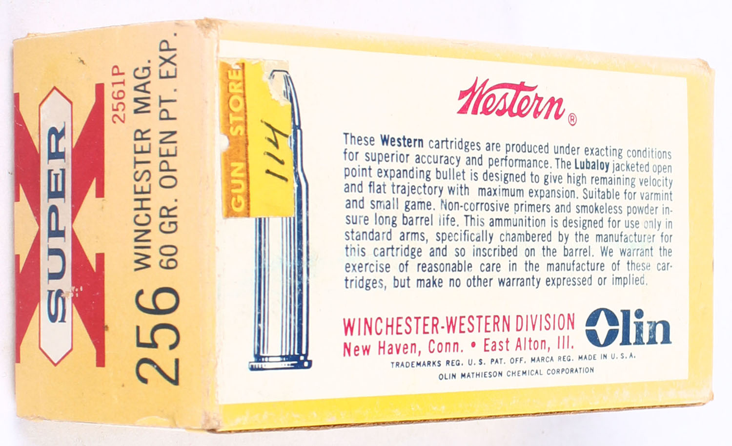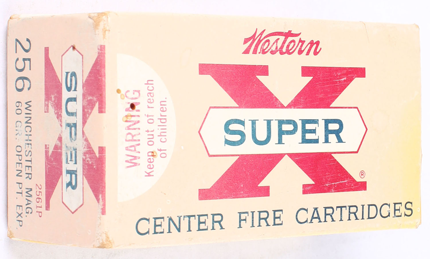 Western, Super X, .256 Winchester Magnum, 60 Grain Open Point Expanding, Full, 1pc. Yellow white & red box, box is solid with excellent color, front has sun damage, edges are mostly crisp, end flaps are solid, ammo is excellent. Grade: Very Good - Value: 100 to 150