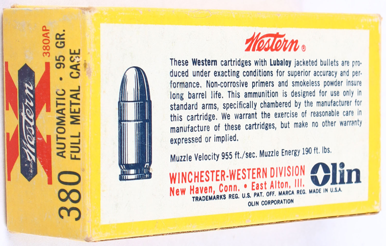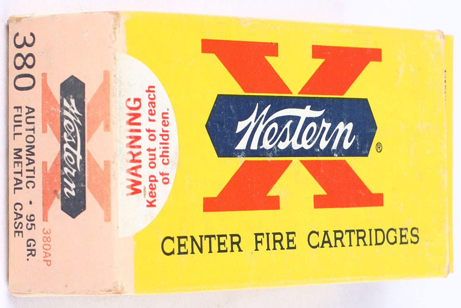 Western, X, .380 Automatic, 95 Grain Full Metal Case Lubaloy, Full, 1pc. Yellow white & red box, box is very solid with excellent color, has very minor scuffing, edges are mostly crisp, end flaps are solid, ammo is excellent. Grade: Excellent - Value: 30 to 45