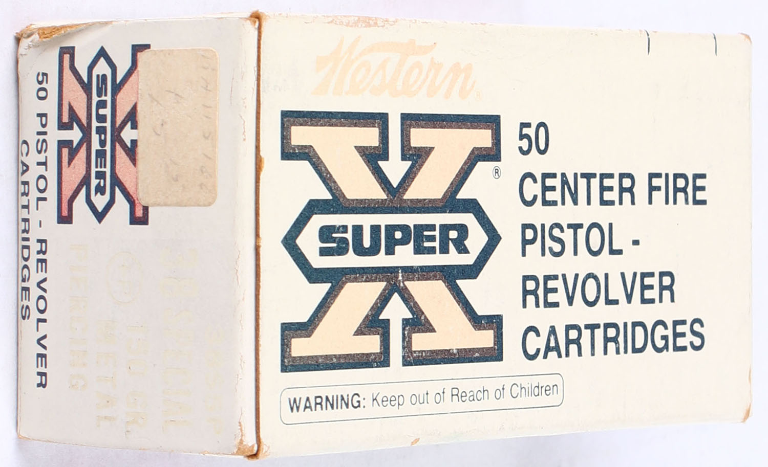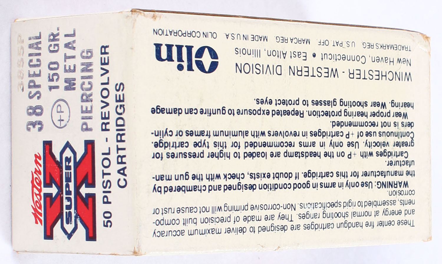Western, Super X, .38 Special +P, 150 Grain Metal Piercing, Full, 1pc. White red & black box, box is solid with good to very good color, color fading, minor shelf wear, very minor corner wear, edges are crisp, end flaps are solid, ammo is minty. Grade: Very Good ++ - Value: 50 to 75