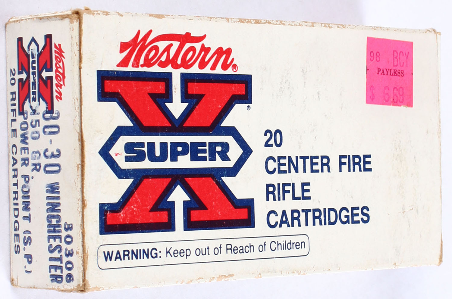 Western, Super X, .30-30 Winchester, 150 Grain Power Point, Full of mixed ammo, 1pc. White red & black box, box is solid with good color, has edge & corner wear, end flaps are solid, ammo is very good. Grade: Very Good ++ - Value: 20 to 30