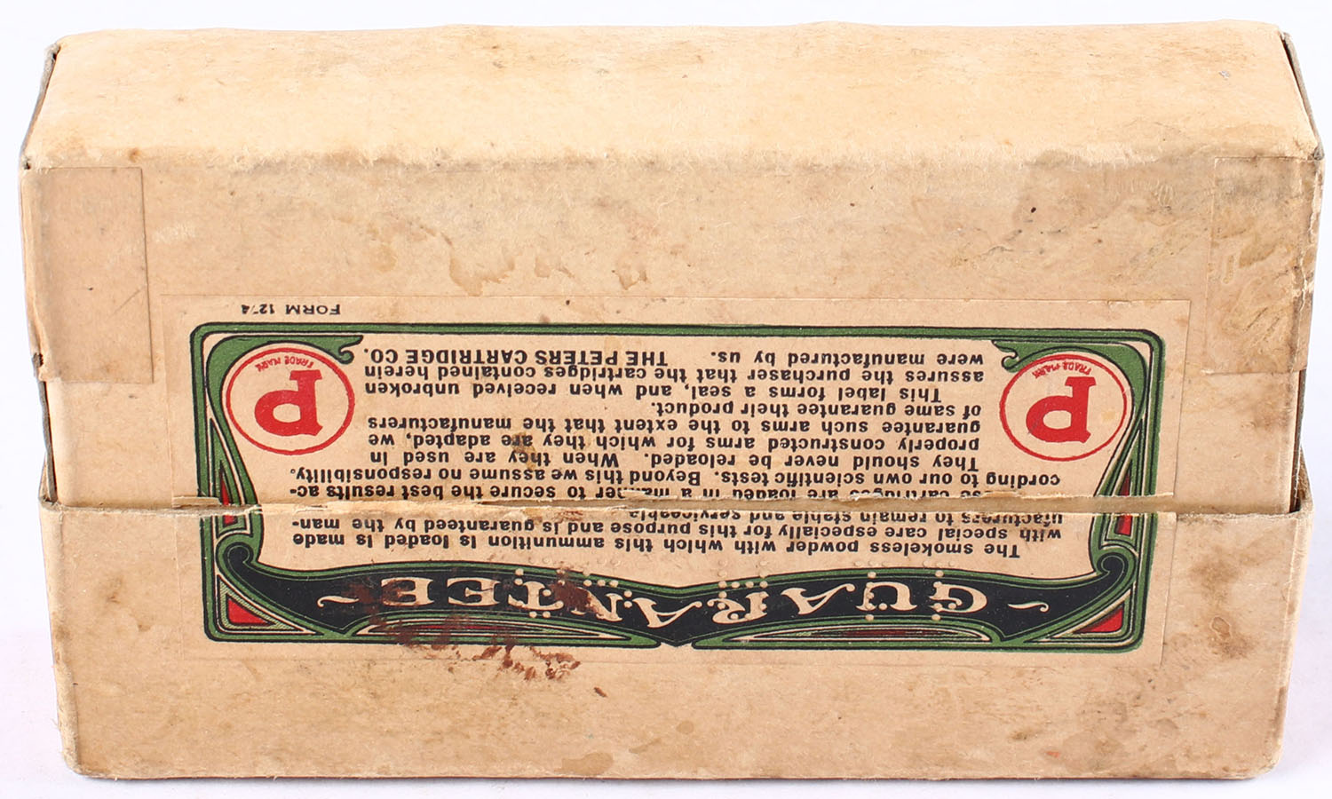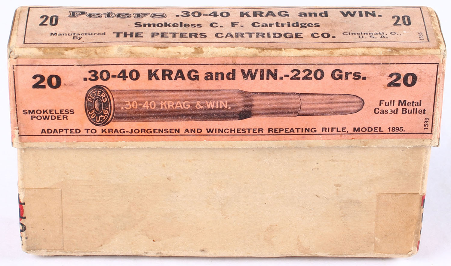 Peters, .30-40 Krag & Win., 220Gr. Full Metal cased bullet, smokeless powder, 2pc, Full, Buff box with salmon label & black print, box is solid with light age soiling, light wear on bottom from bullets, light rub marks, & light edge wear, ammo is very good. Grade: Very Good ++ - Value: 20 to 30