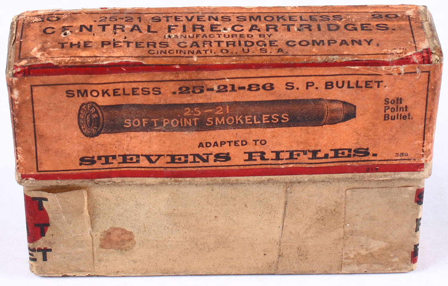 Peters, Central Fire Cartridges, .25-21 Stevens, Soft Point Smokeless, FULL & SEALED, 2pc. Buff box with orange & side sealing label, box has age soiling with edge & corner wear, labels are intact. Grade: Excellent - Value: 200 to 300